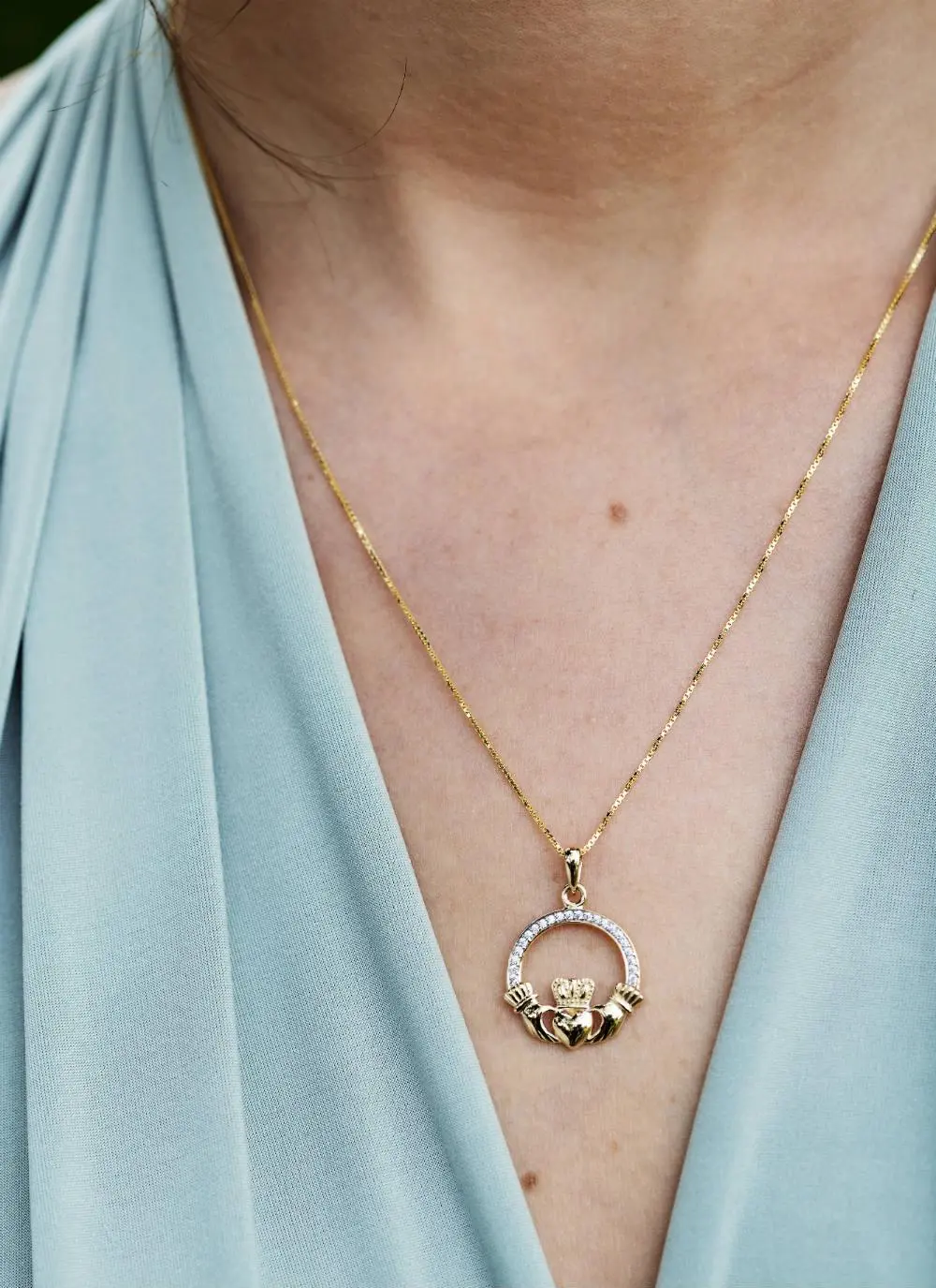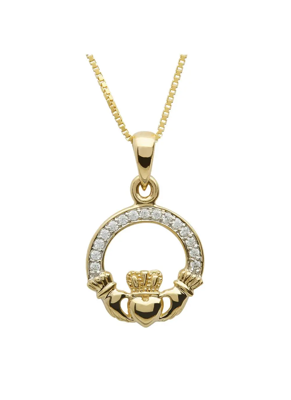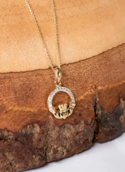 The Claddagh design is showcased beautifully in this pendant with intricate details, enhanced with sparkling pave set embellishments. The Claddagh’s distinctive design features two hands clasping a heart surmounted by a crown. The elements of this symbol are often said to correspond to the qualities of love (the heart), friendship (the hands), and loyalty (the crown).
