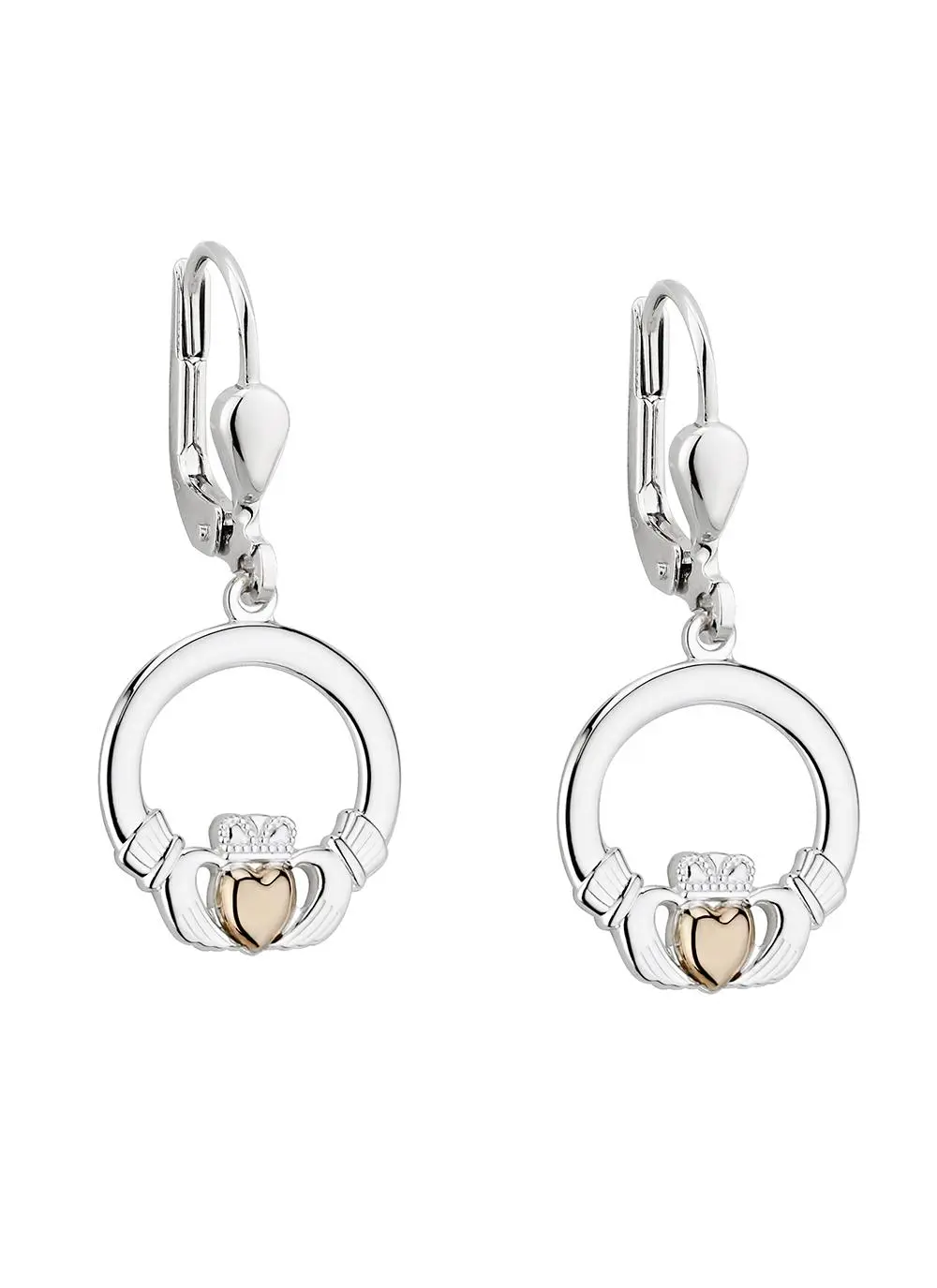 The traditional Claddagh is showcased beautifully in these drop earrings and is further enhanced with a heart of 10K yellow gold. The Claddagh’s distinctive design features two hands clasping a heart surmounted by a crown. The elements of this symbol are often said to correspond to the qualities of love (the heart), friendship (the hands), and loyalty (the crown).