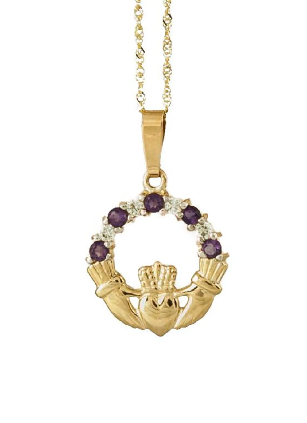 The Claddagh is an iconic Celtic symbol whose heart, hands and crown represent love, friendship and loyalty. This beautiful ten karat gold pendant features amethyst stones with cubic zirconia surrounding them. The perfect Irish gift for a loved one.