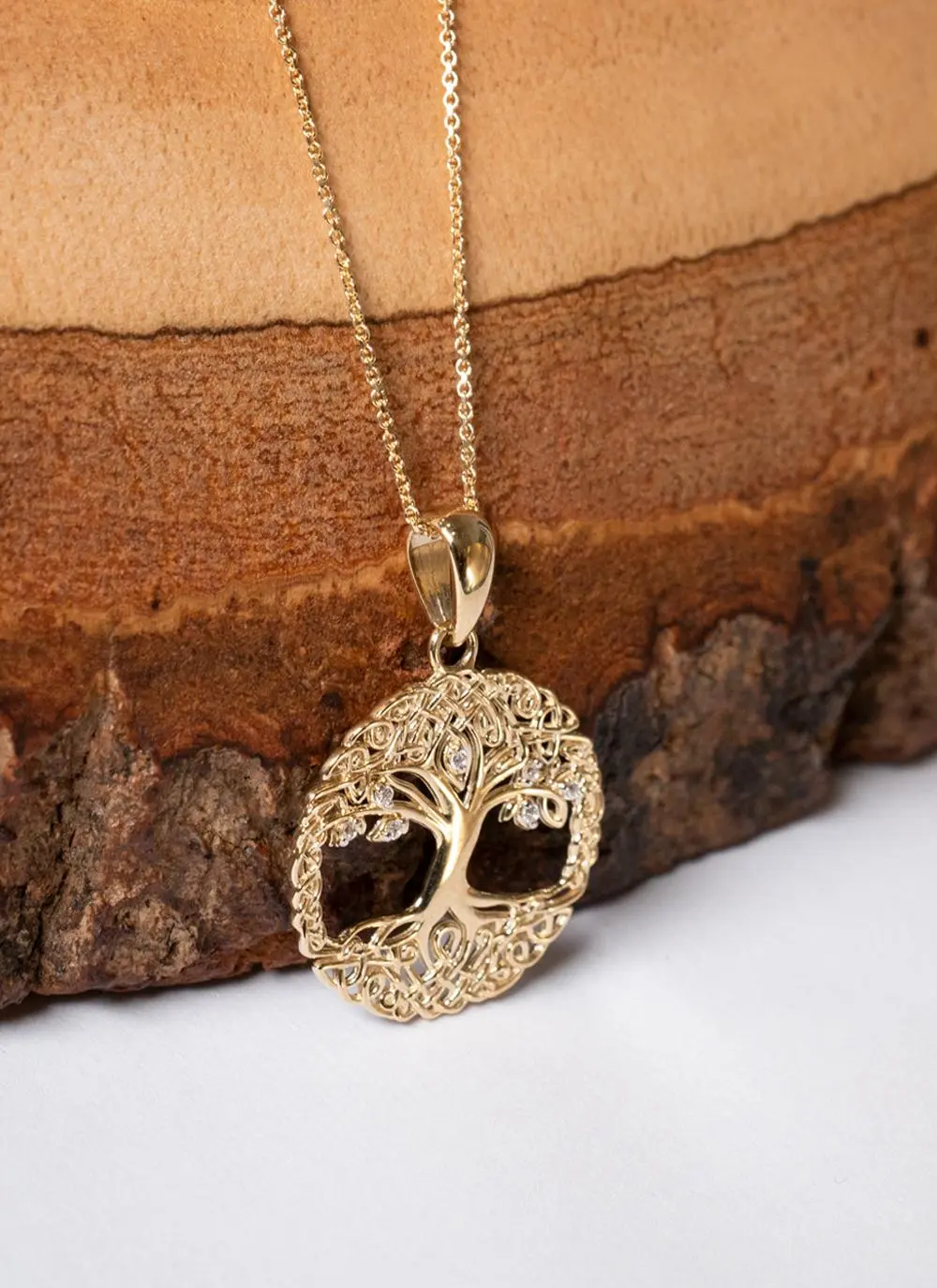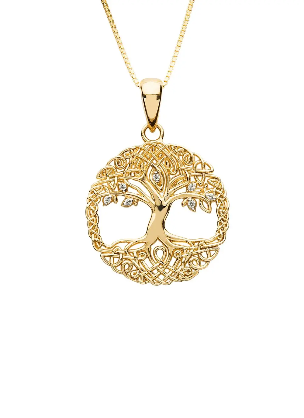 Dating back to the Celts, the tree of life is an enduring Irish motif symbolizing the patience to grow, the strength to endure and the wisdom to flourish. Exquisite gold winds throughout this pendant in an elaborate Celtic knot pattern in filigree fashion. It is beautifully set with sparkling cubic zirconia stones.
