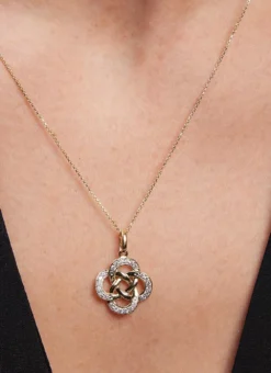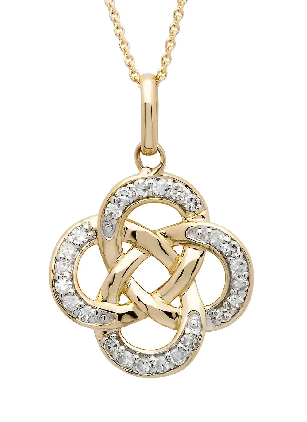 Exquisitely crafted in 14ct gold and embellished with sparkling diamonds, this pendant has been designed as a four corner Celtic knot whose daintily interlaced outer curves are encrusted with glittering clear stones. The ancient symbol of the four corner Celtic knot signifies the four elements of earth, water, air and fire.Â