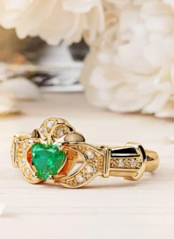 Mark the occasion of a lifetime with this stunning Claddagh 14-carat gold engagement ring, set with diamonds and an emerald at its center. The Claddagh is an ancient Irish symbol of love, friendship and loyalty – three pillars of a prosperous marriage. What makes this piece truly special is its stackable matching wedding band whose shape slots perfectly against the grooves of the Claddagh. A truly spectacular set to be cherished forevermore.