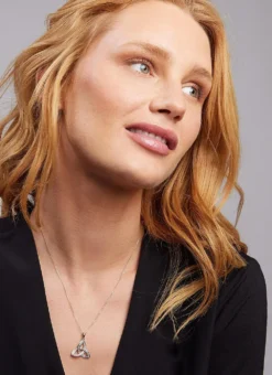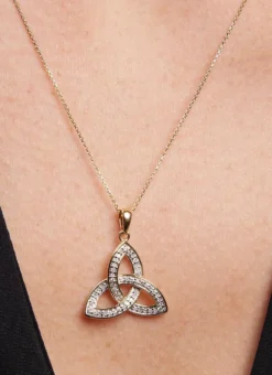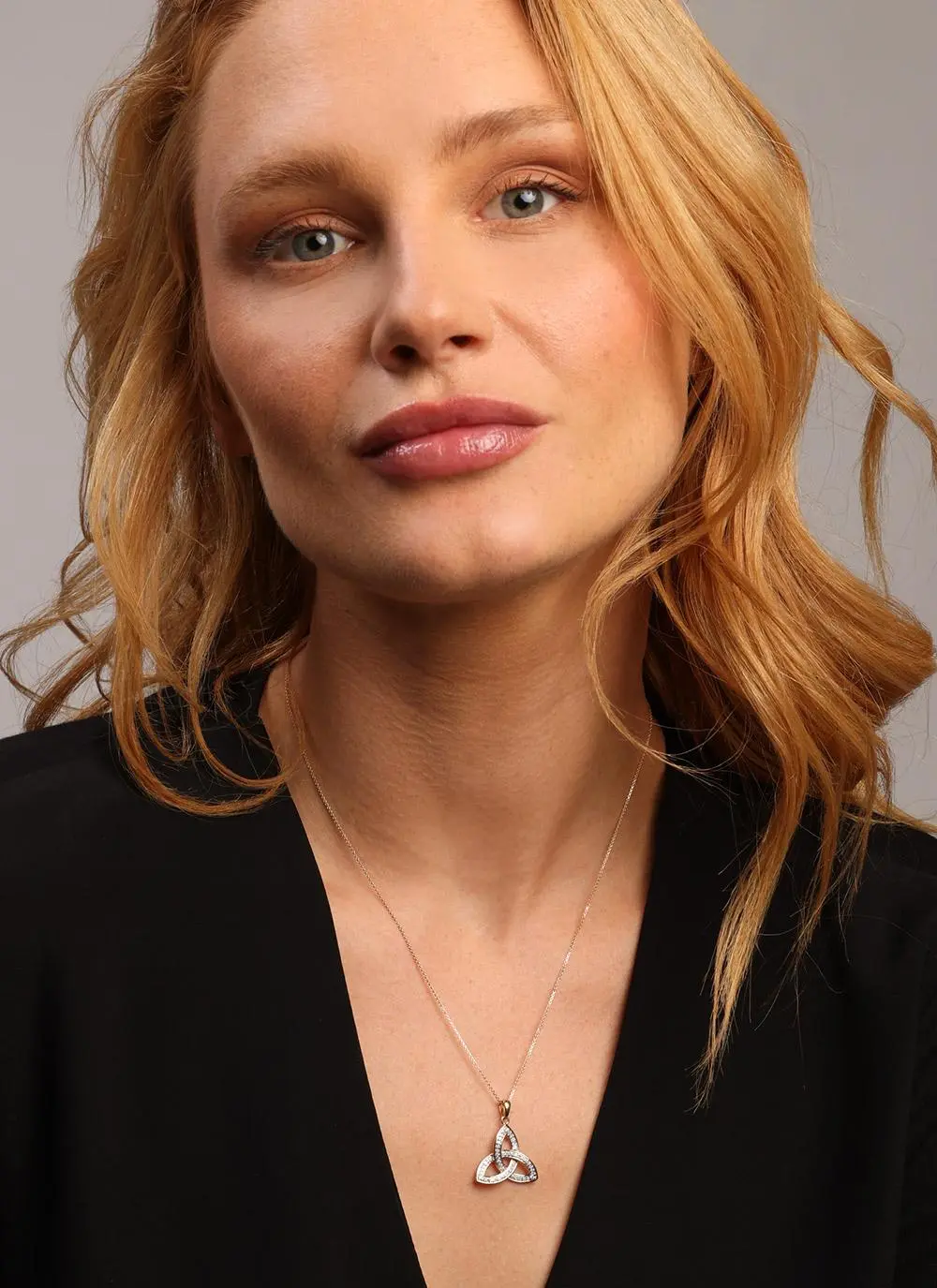 Our 14ct diamond and gold pendant has been styled in a classic trinity knot design and is embellished with sparkling genuine diamonds. This iconic symbol has three interconnected “leaves” making an eternal form that can’t be untied. Given this elemental form, this design has been adopted by many different groups and cultures through time including the Celtic Irish.
