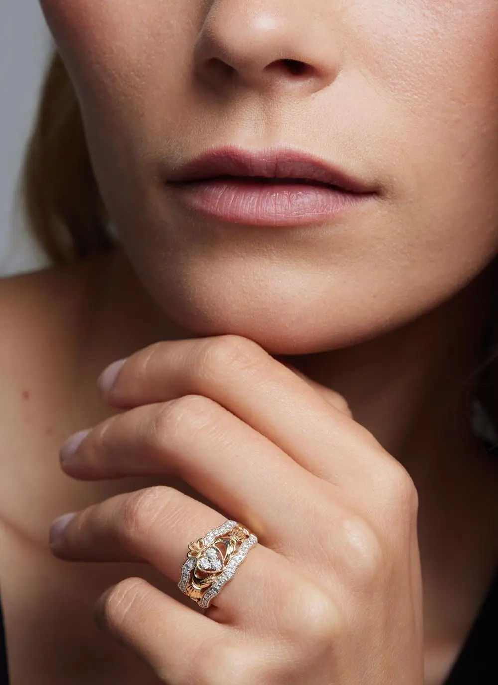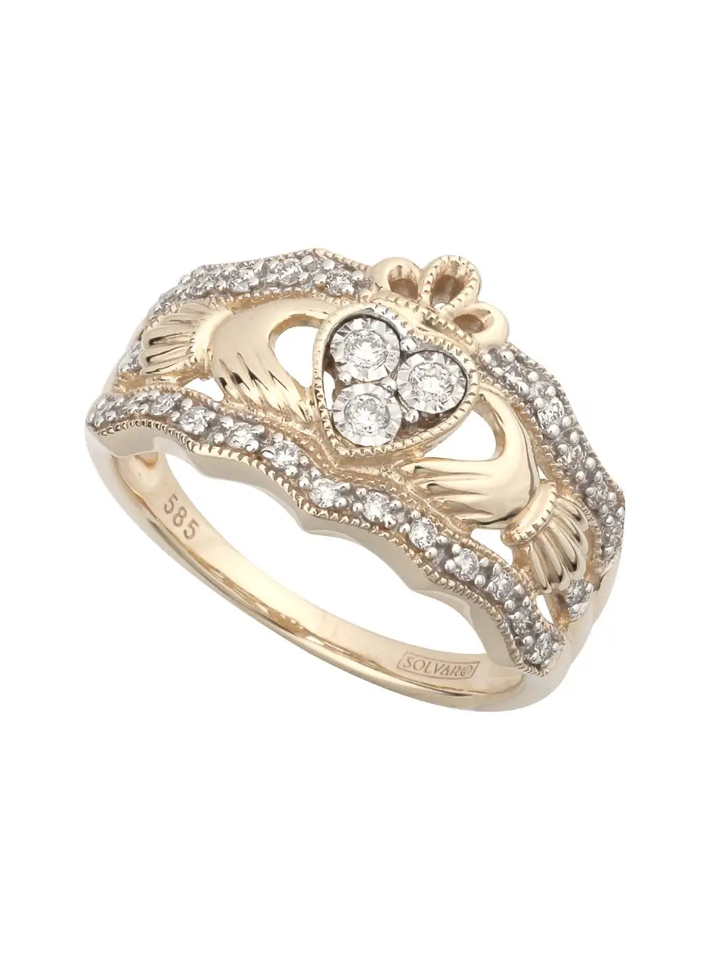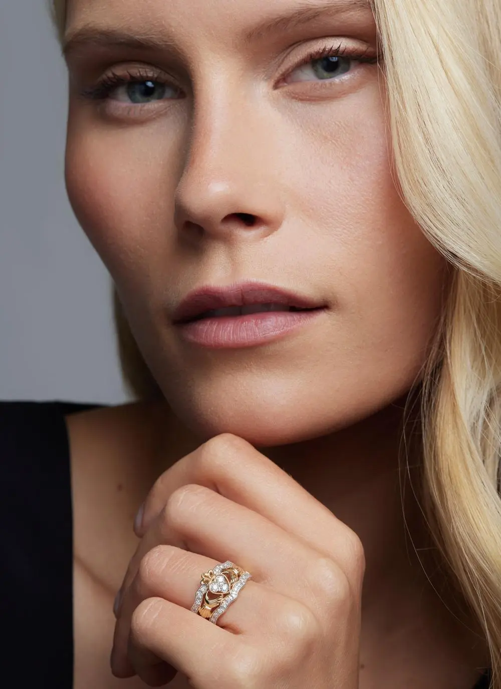 An embellished take on the classic Claddagh, this statement ring is a truly special piece with lasting appeal. The heart is set with three brilliant round cut diamonds, framed by micro diamonds encrusted along the shoulders. These precious stones complement the 14ct yellow gold band beautifully for a luxurious finish that will elevate any ensemble. The perfect Irish gift for your loved one.