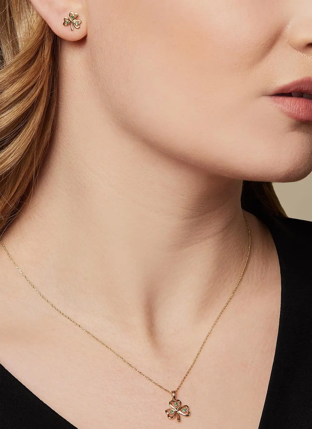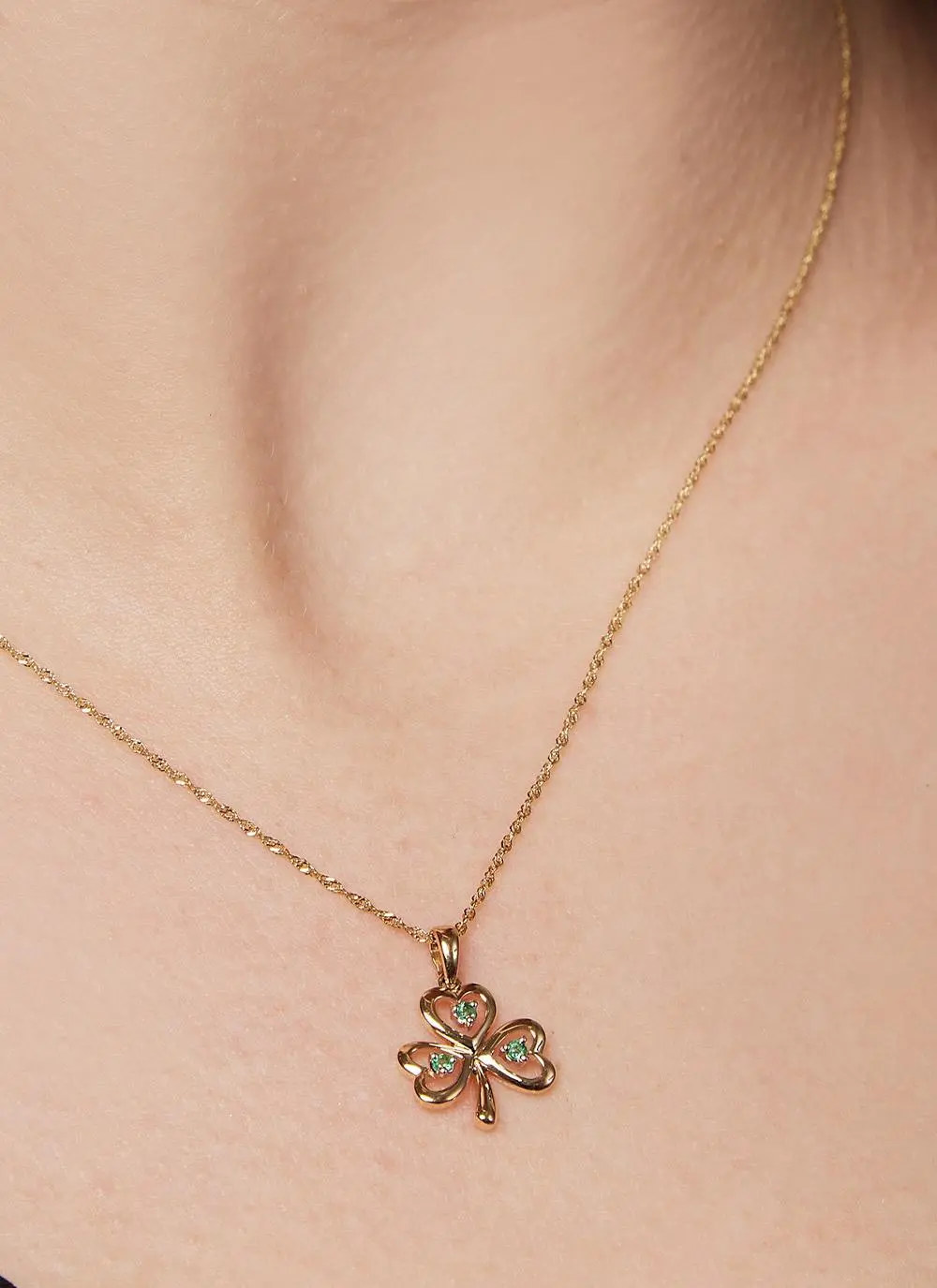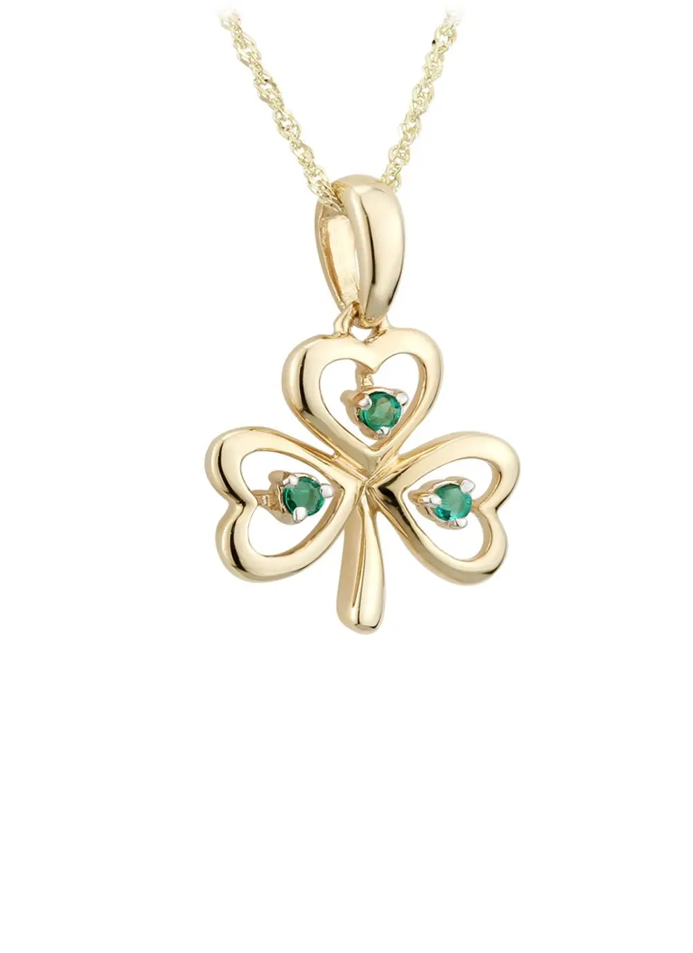Created from shining 14ct yellow gold, our shamrock pendant is accompanied by three stunning emerald stones, delicately placed on the inside of its three leaves.  A sign of good luck for those who wear it, the shamrock is a world-renowned symbol of Ireland.