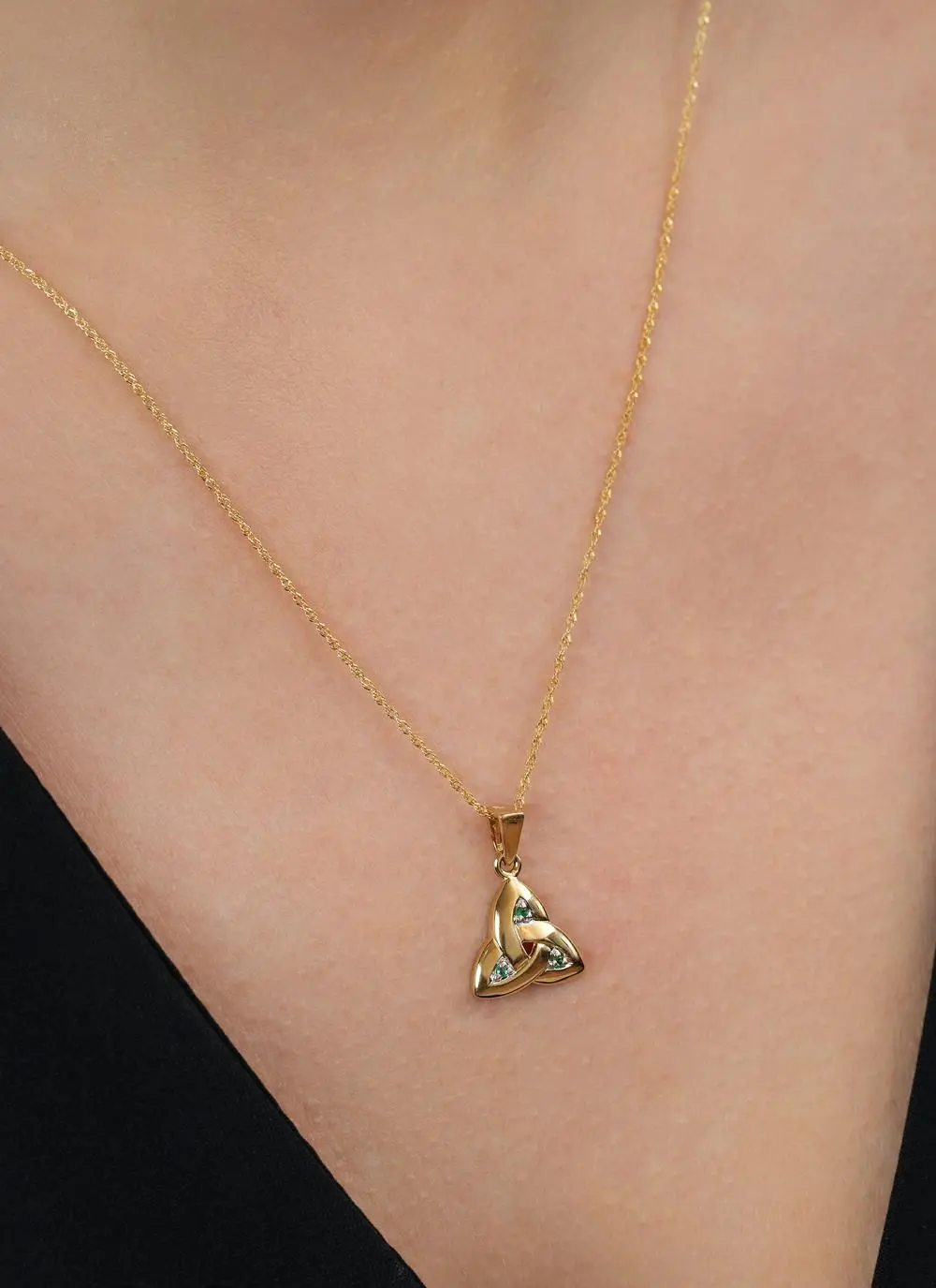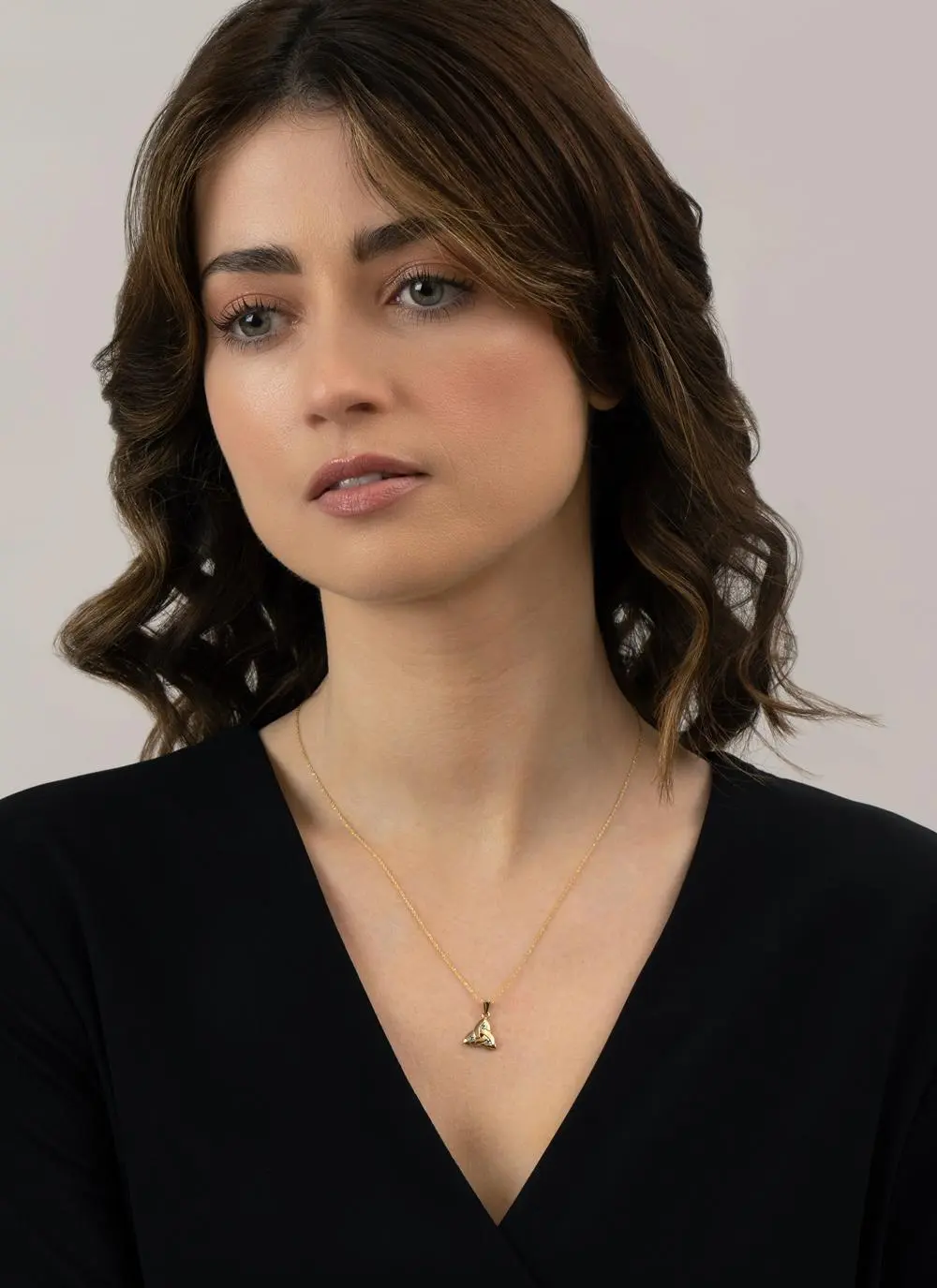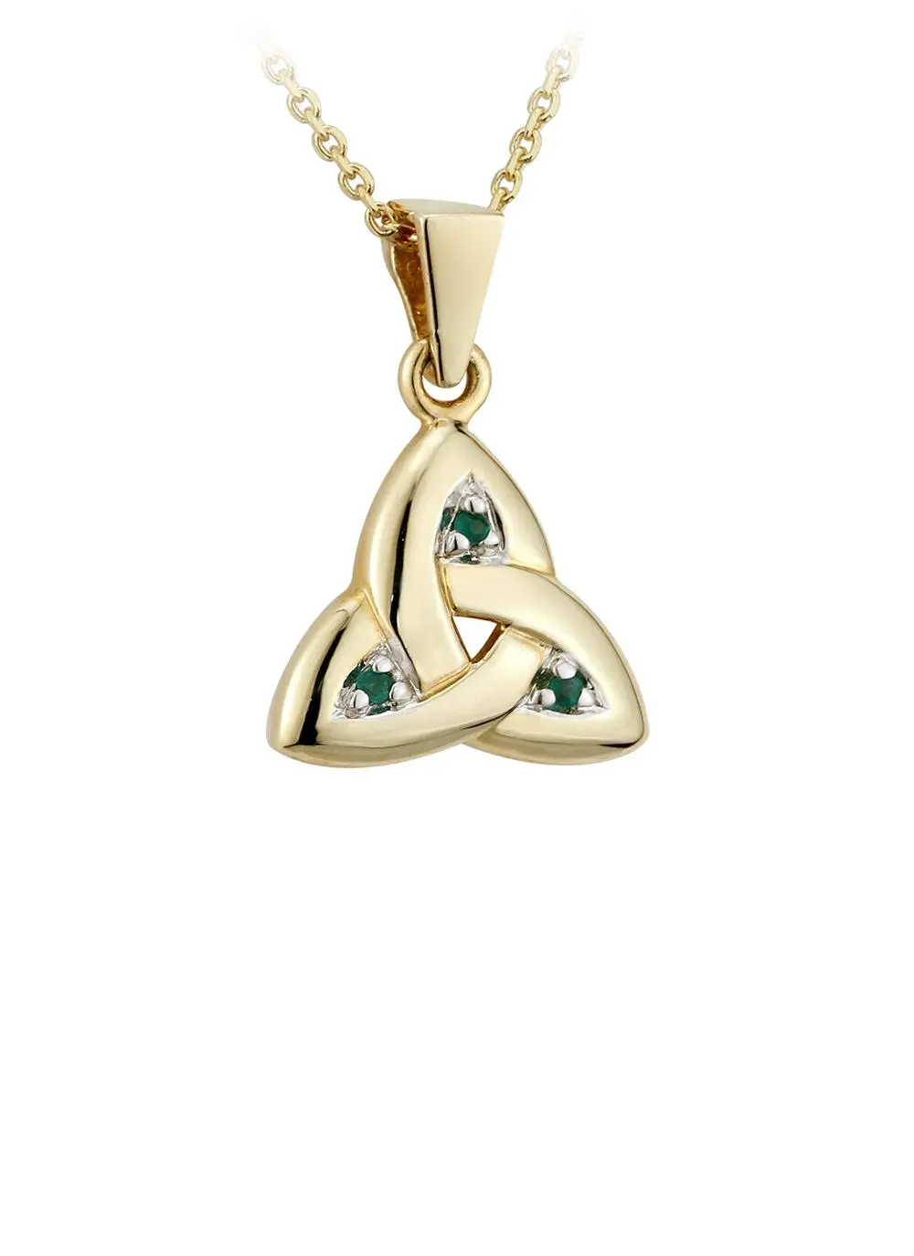 This 14ct gold trinity knot Celtic pendant is accompanied by three stunning emerald stones, delicately placed on the inside of the triangle. This iconic symbol has three interconnected “leaves” making an eternal form that can’t be untied. Given this elemental form, this design has been adopted by many different groups and cultures through time including the Celtic Irish.