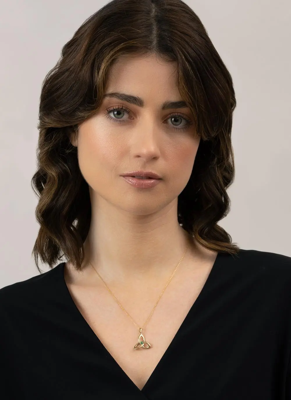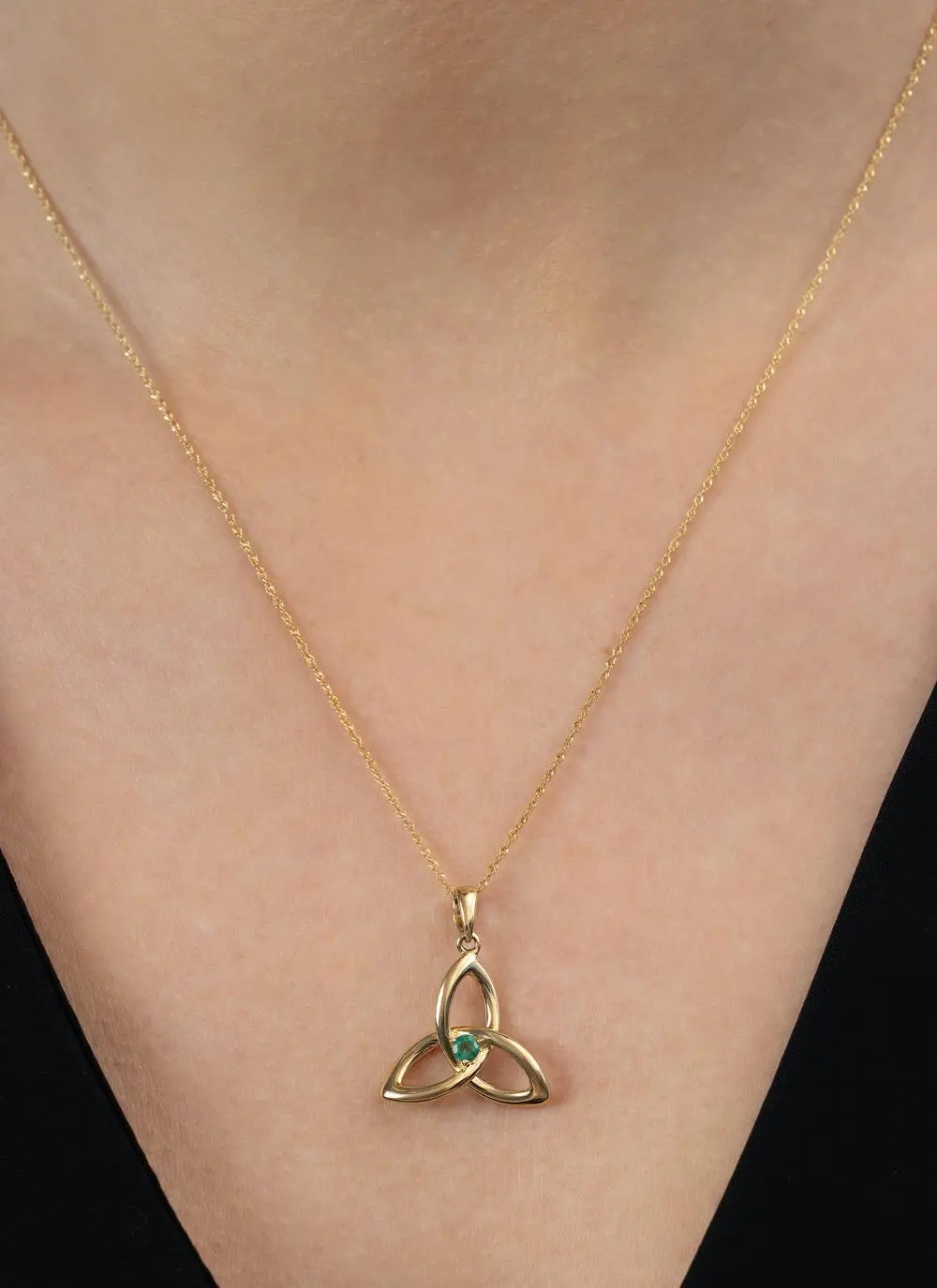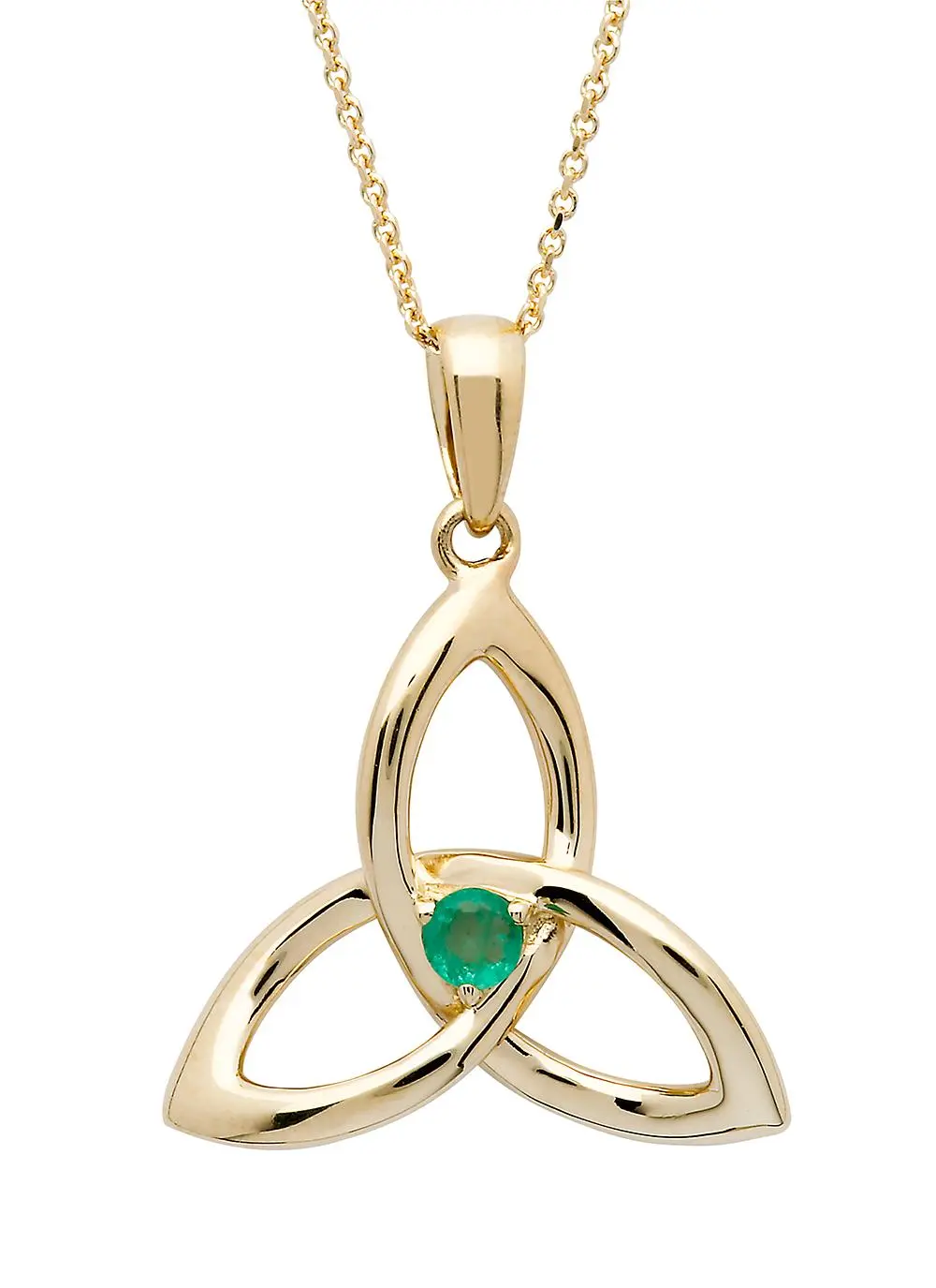Our emerald and gold trinity knot pendant has been crafted in 14ct gold and embellished with a sparkling emerald at the centre. This iconic symbol has three interconnected “leaves” making an eternal form that can’t be untied. Given this elemental form, this design has been adopted by many different groups and cultures through time including the Celtic Irish.