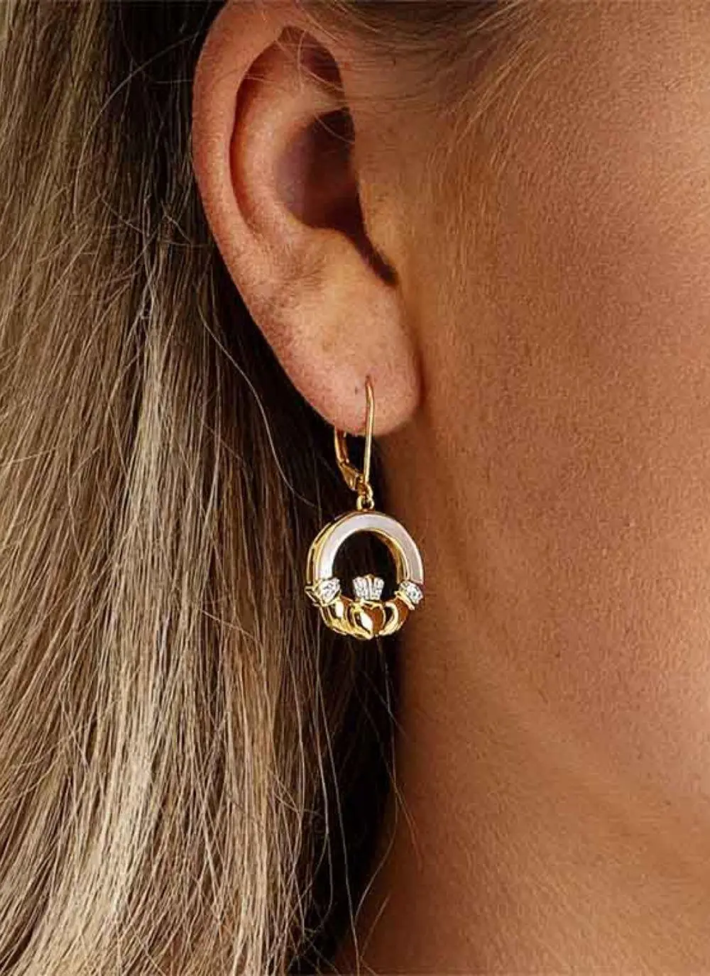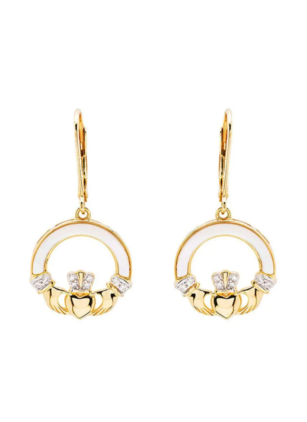 Add something truly special to your jewelry collection with these Claddagh drop earrings, set with shimmering mother of pearl. The heart, hands and crown of the iconic Celtic Claddagh symbolize love, friendship and loyalty respectfully – making this pair the perfect gift for a loved one. Complete the look with this beautiful matching pendant.