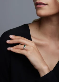 Mark the occasion of a lifetime with this stunning Claddagh 14-carat white gold engagement ring, set with diamonds and an emerald at its center. The Claddagh is an ancient Irish symbol of love, friendship and loyalty – three pillars of a prosperous marriage. What makes this piece truly special is its stackable matching wedding band whose shape slots perfectly against the grooves of the Claddagh. A truly spectacular set to be cherished forevermore.