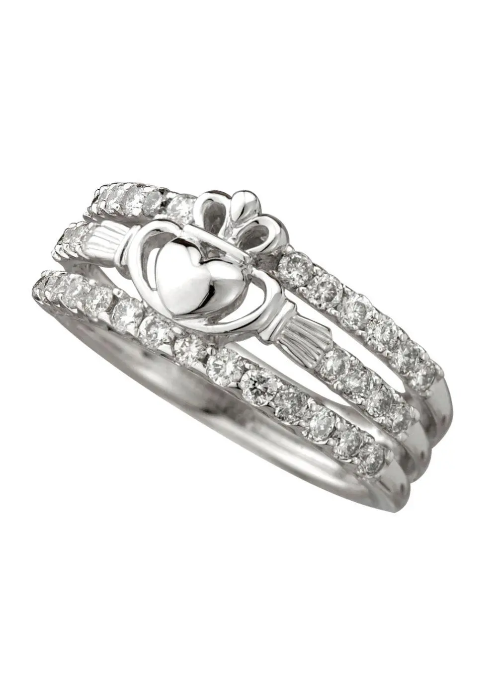 This exquisite Claddagh ring is a masterpiece in fine jewelry making. It is flawlessly crafted from lustrous white gold and precious diamonds for a radiant, luxurious finish that will elevate any look.The Claddagh is an iconic Celtic symbol whose heart, hands and crown represent love, friendship and loyalty. Hallmarked in Dublin Castle, this piece makes an authentic Irish gift whose appeal will transcend generations.