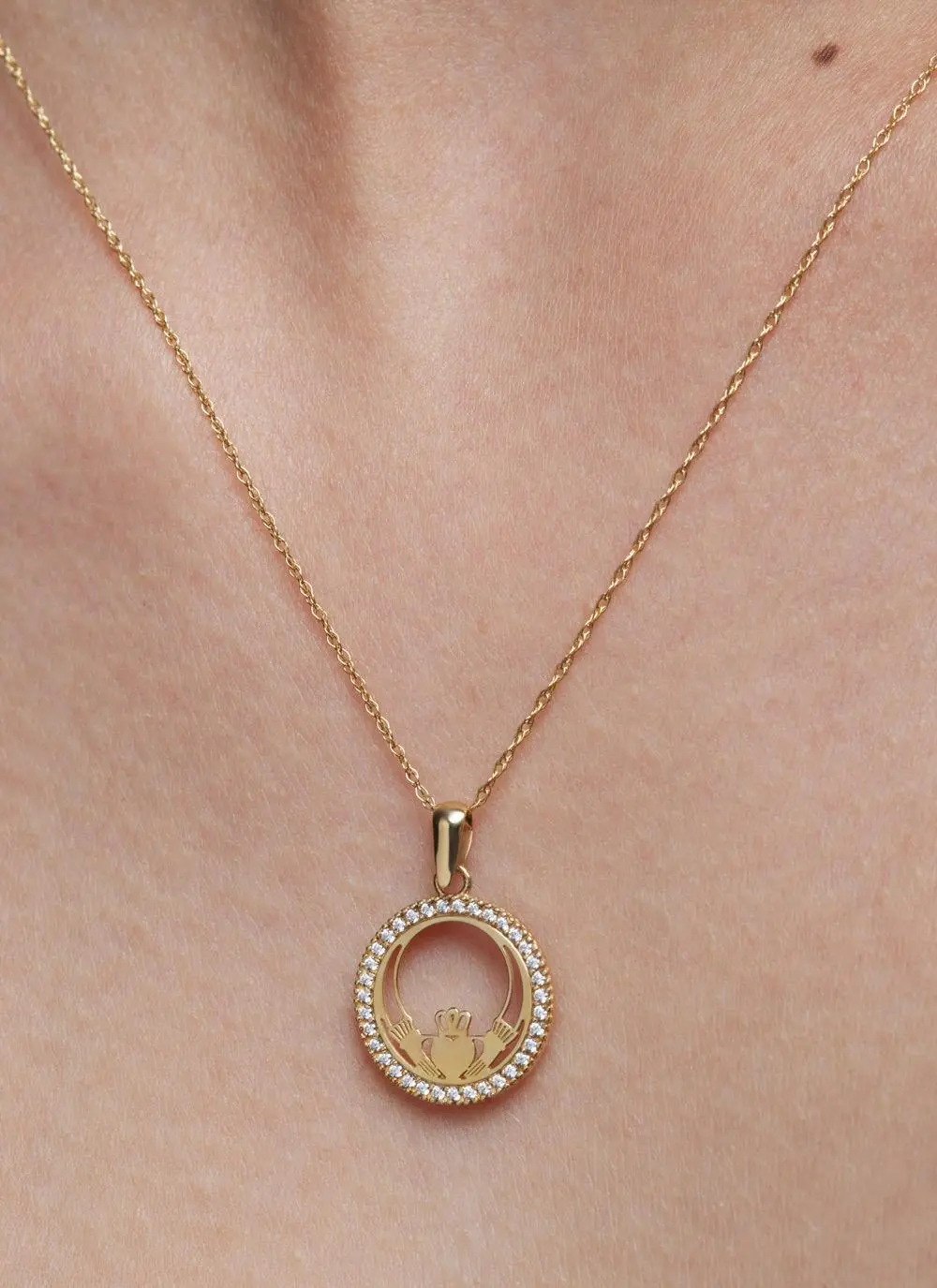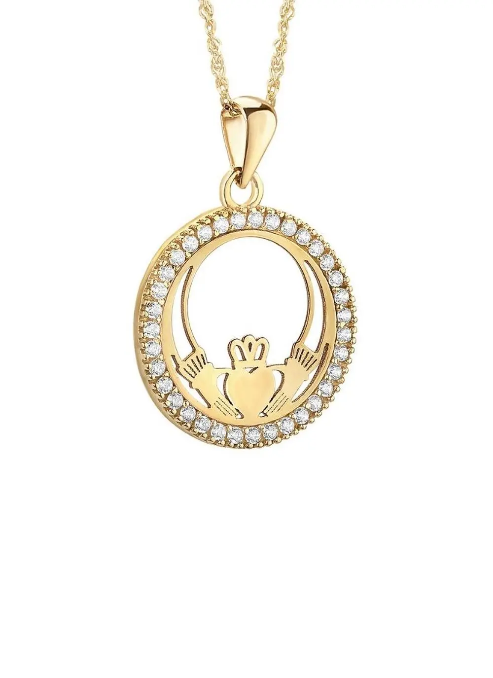 This 9-carat gold Claddagh pendant hangs from a delicate sing chain and is embellished with brilliant cubic zirconia stones. The Claddagh is a precious Celtic symbol of love, friendship and loyalty, making this necklace a truly special gift for someone with Irish roots. Beautifully presented in a branded box.