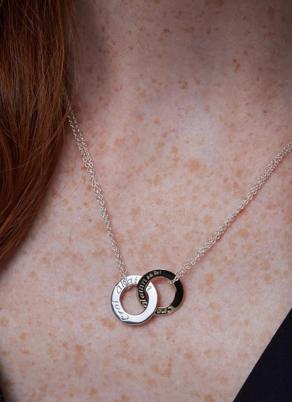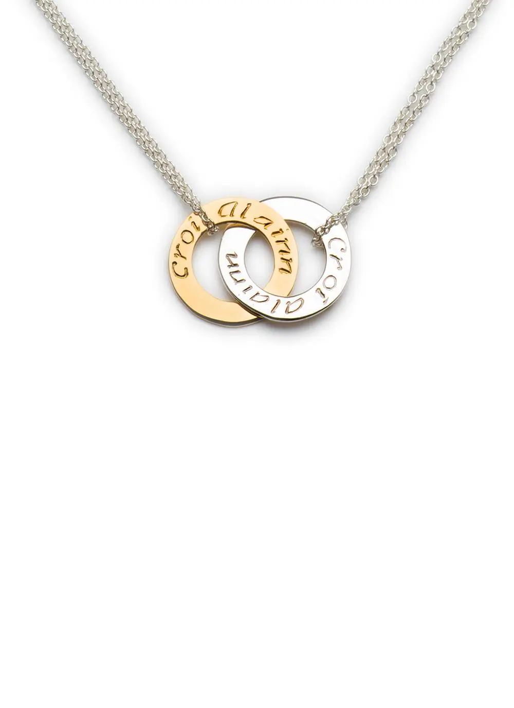 Focusing on tradition and simplicity, the expert jewelry makers at the Enibas studio in West Cork created this elegant silver and gold mini pendant. This Celtic pendant bears the inscription “Croí Álainn” which translates as “beautiful heart” in the native Irish language.