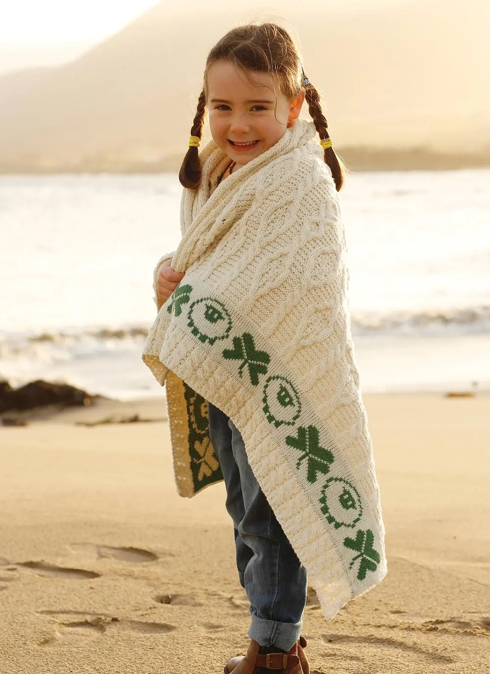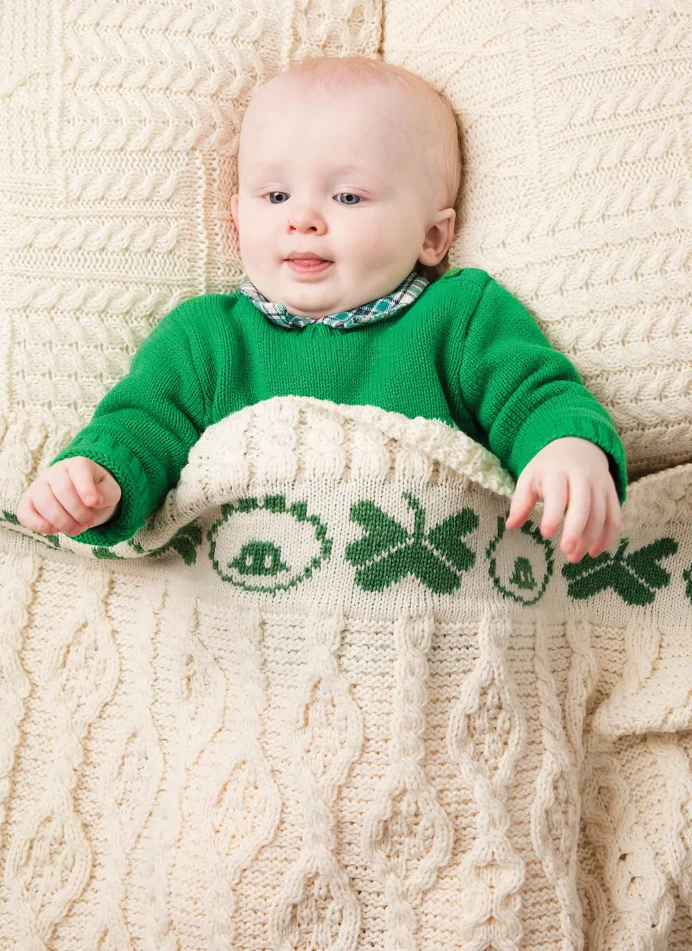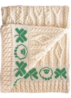 Keep your baby warm and safely wrapped up with this super-soft Aran blanket. Knit with 100% merino wool, it contains many of the traditional Aran stitches and has the added detail of adorable green sheep and shamrock motifs. You’re never too young to embrace your Irish heritage.