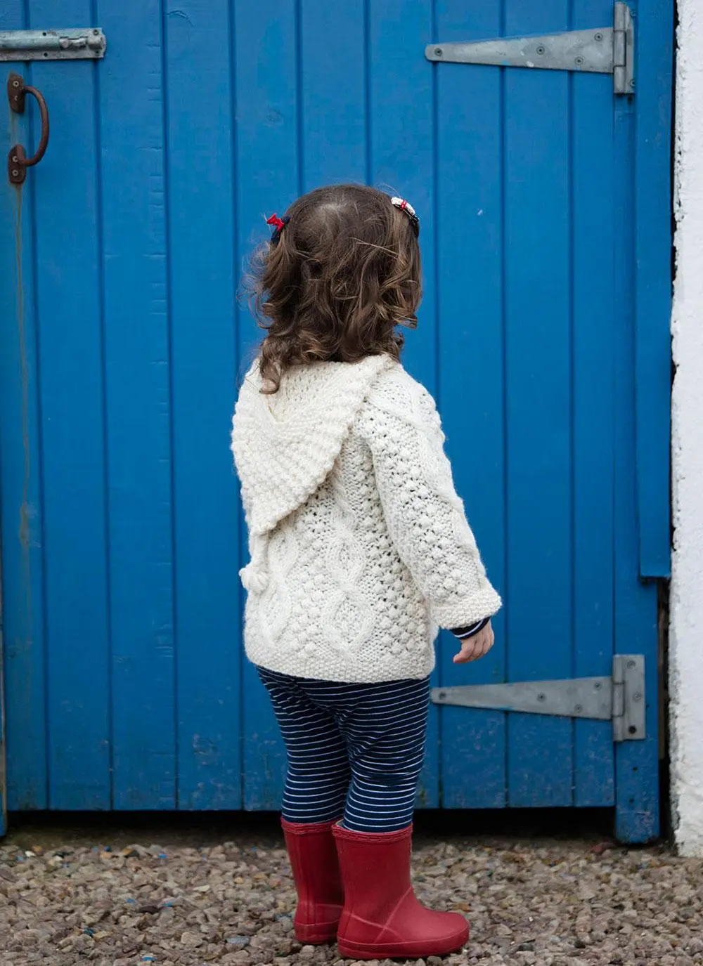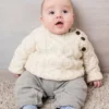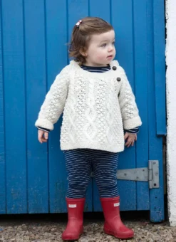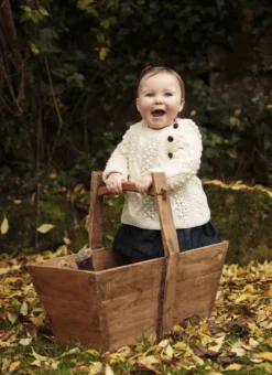 This adorable baby Aran Hoodie has been hand-knit with 100% soft Merino wool. It has three shoulder buttons to ensure that it can be taken on and off easily. It also has a warm and cozy hood with an added tassel. Wrapped in history, this sweater has been knit with many of the traditional Aran stitches such as diamond, cable and blackberry.