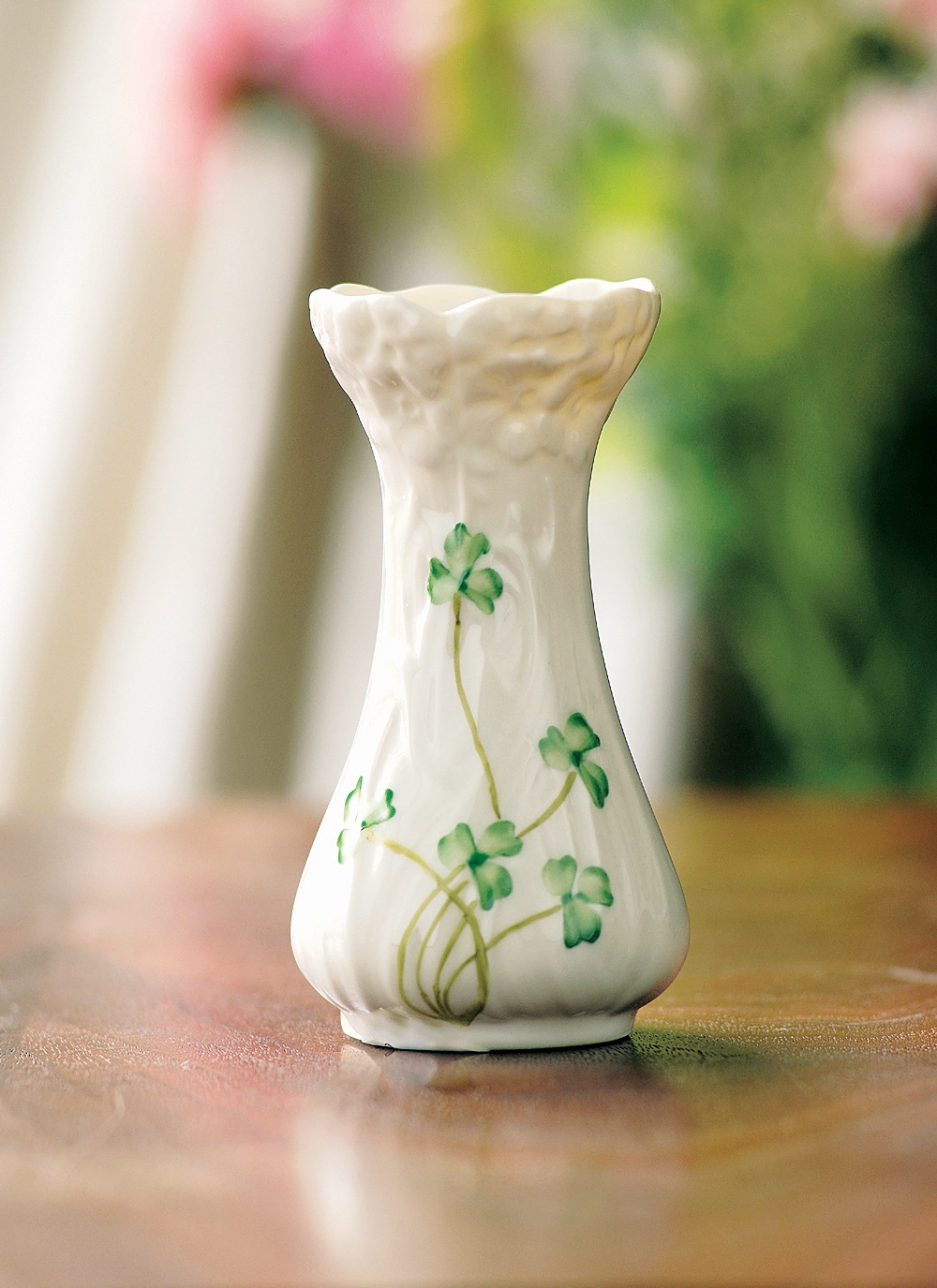 Made from fine Parian china, Belleek’s unique Daisy Toy Spill Vase has been hand-painted with Irish shamrocks and is embossed with the daisy design. Belleek’s unique daisy design dates back to the 1890s when designer Frederic Slater was inspired by a young girl clutching flowers in the meadow near the pottery. He immediately sketched the scene which was the inspiration for the shape and design of the daisy collection.
