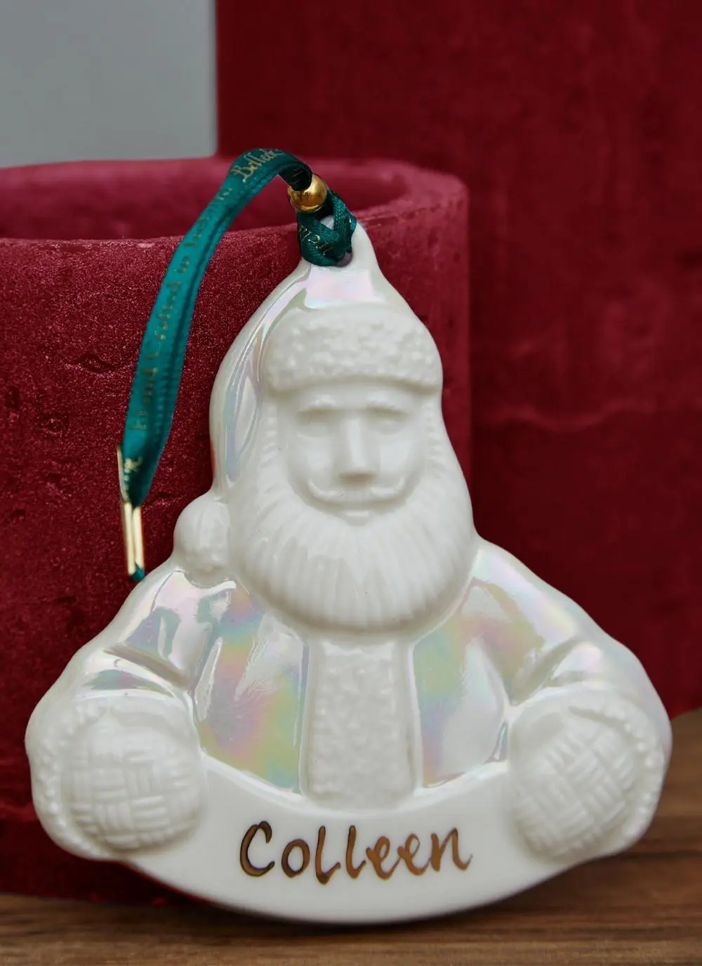 Beautifully designed and handcrafted in Ireland, this personalized Belleek Santa Claus decoration is the perfect gift for the one you love this Christmas. This hand-painted ornament features mother of pearl accents which shine against twinkling fairy lights. Ready to be hung on the tree from its festive green ribbon.