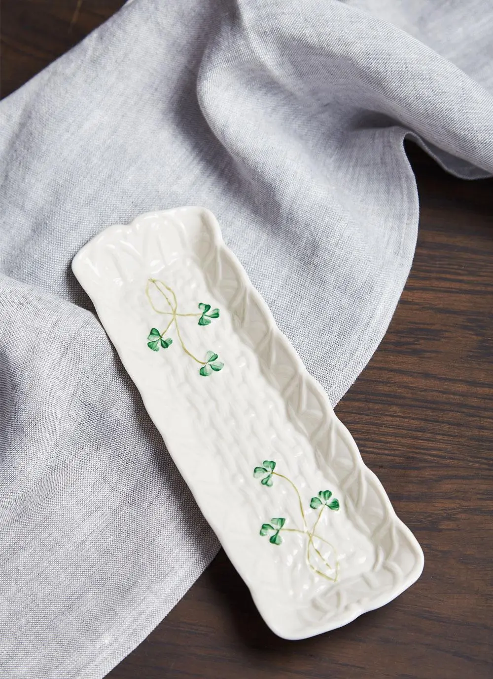 This Shamrock Mint Tray from Belleek has been handcrafted to the highest standard. It is embossed with a basket weave texture and features scalloped edges with hand-painted Irish shamrocks. This tray is guaranteed to take center stage on your tabletop.Â