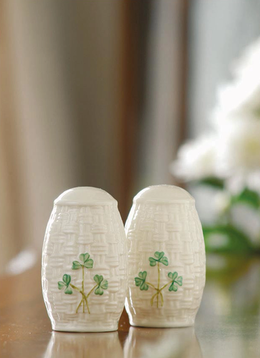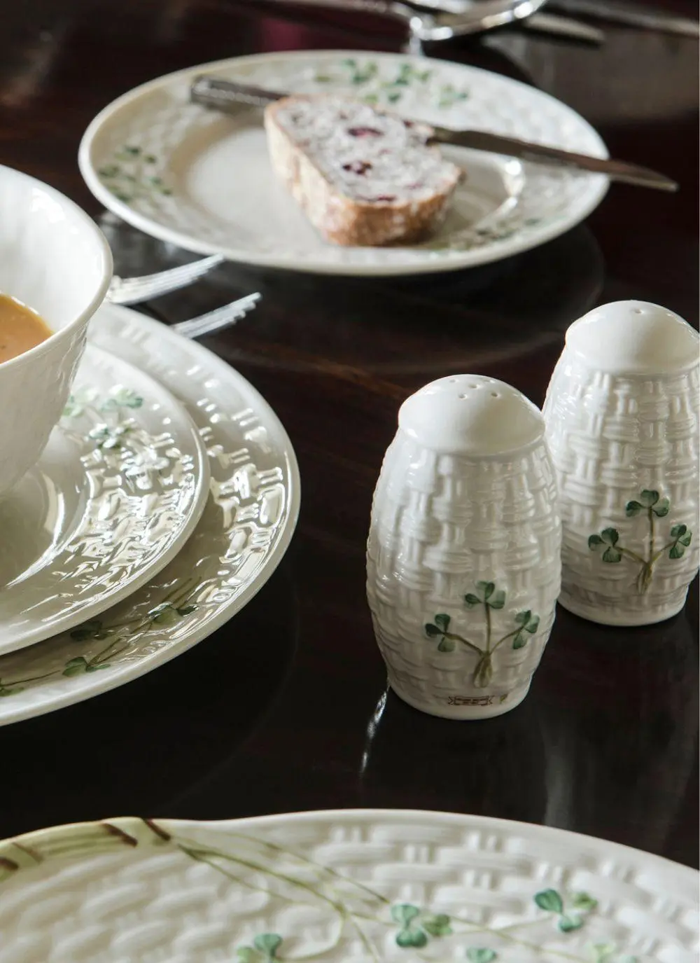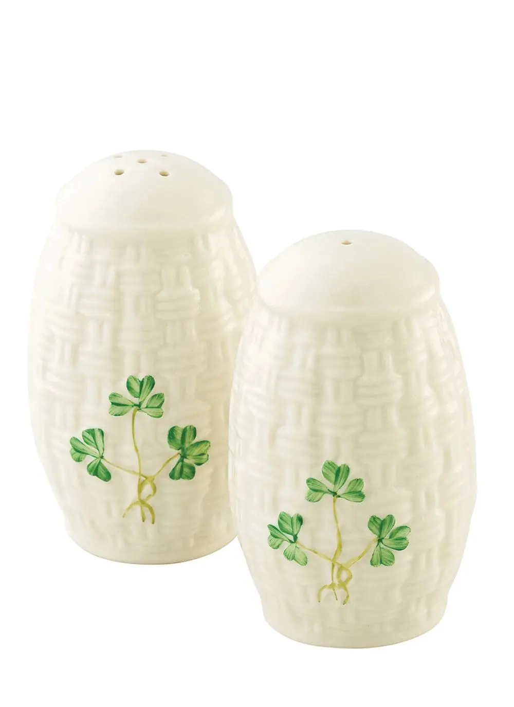 A Pepper and Salt set that is beautifully different. Made in Ireland by Belleek fine Parian china in a basket weave design and hand painted shamrocks.Â