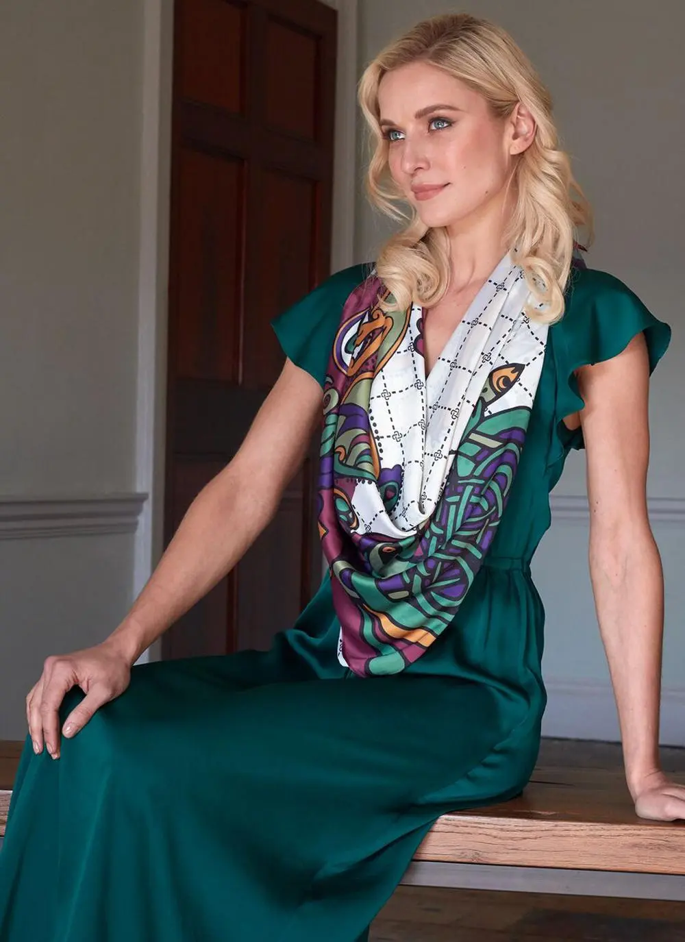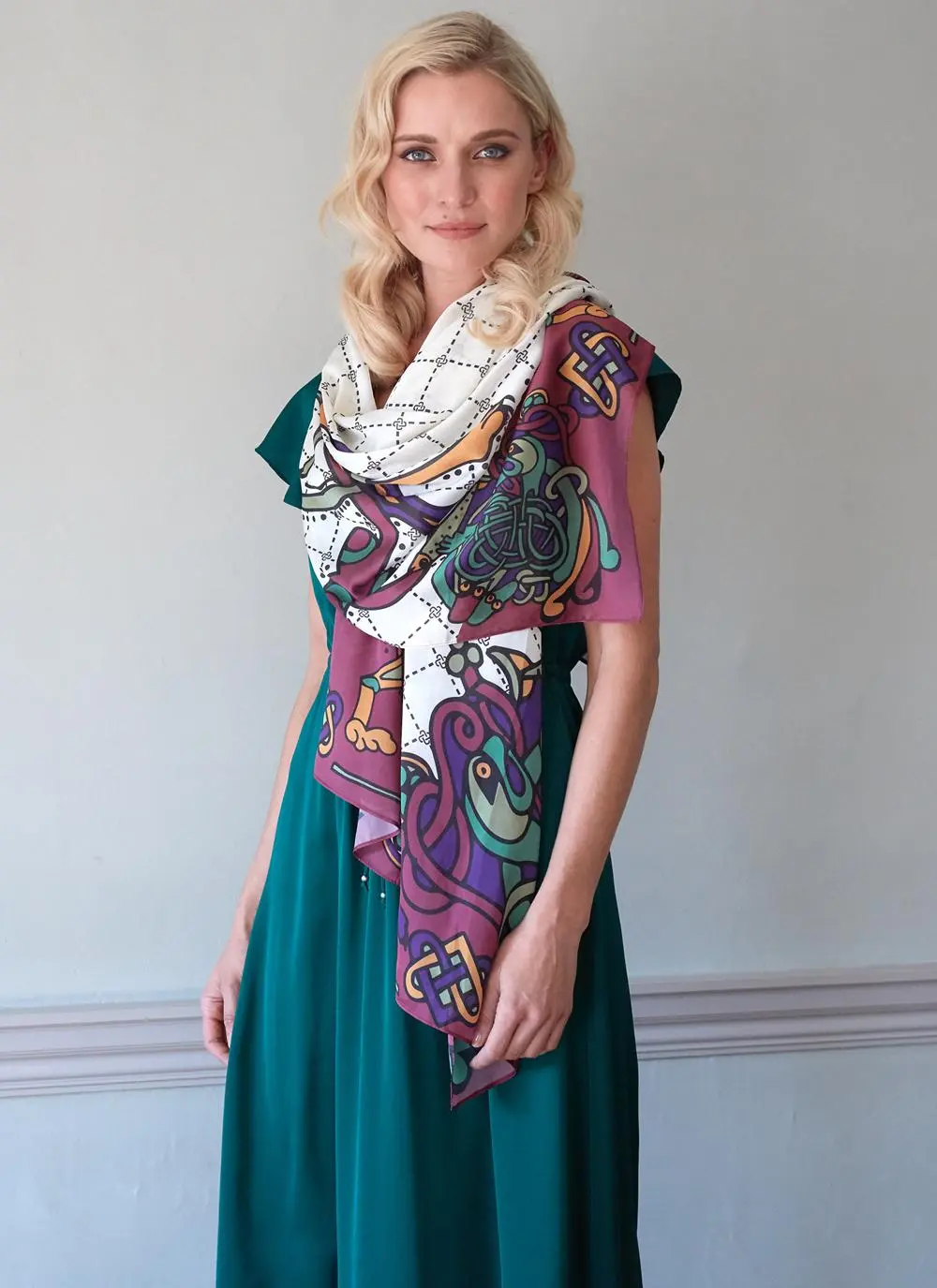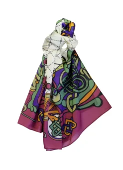 This unique scarf has been inspired by the Book of Kells, a brilliantly decorated manuscript of the four Gospels, created around 800 AD. The Book of Kells is a masterpiece of calligraphy and illumination and is recognized as Ireland’s greatest cultural treasure. This stunning scarf is designed with the intricate iconography from the manuscript.