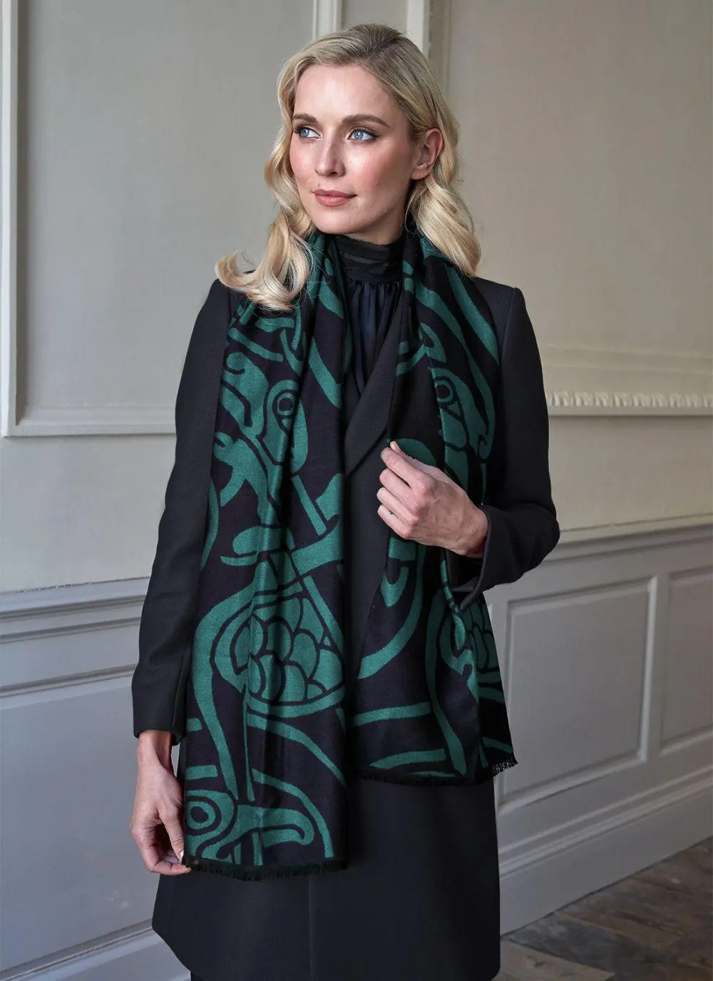 This green and black reversible scarf is part of The Book of Kells collection. Made from the softest fibers, the Celtic designs in contrasting bold colors make this a stylish and practical accessory.