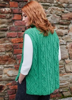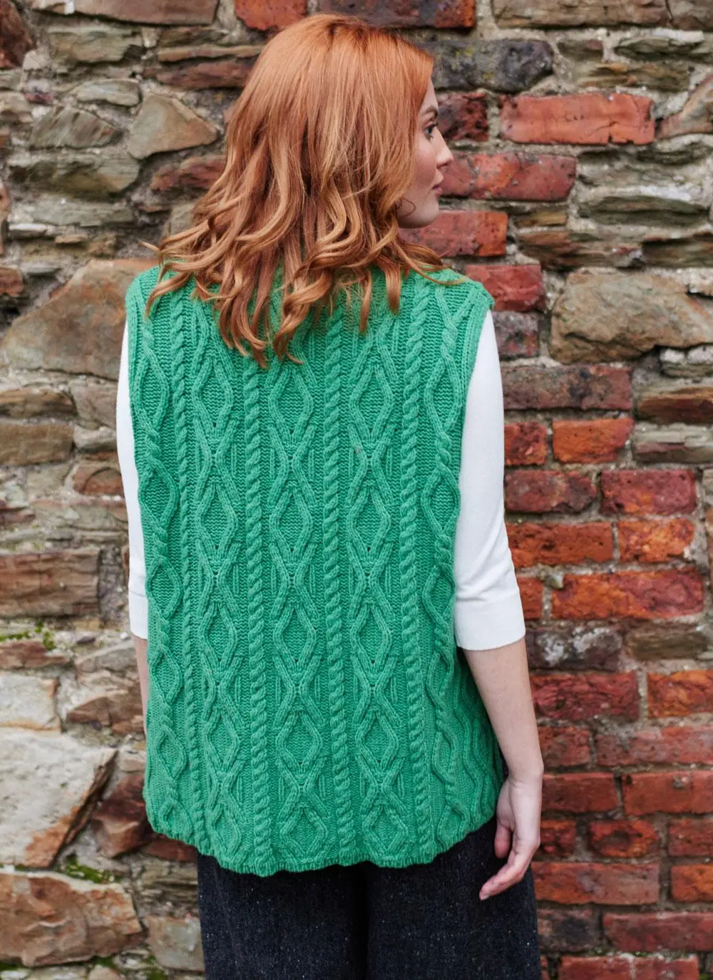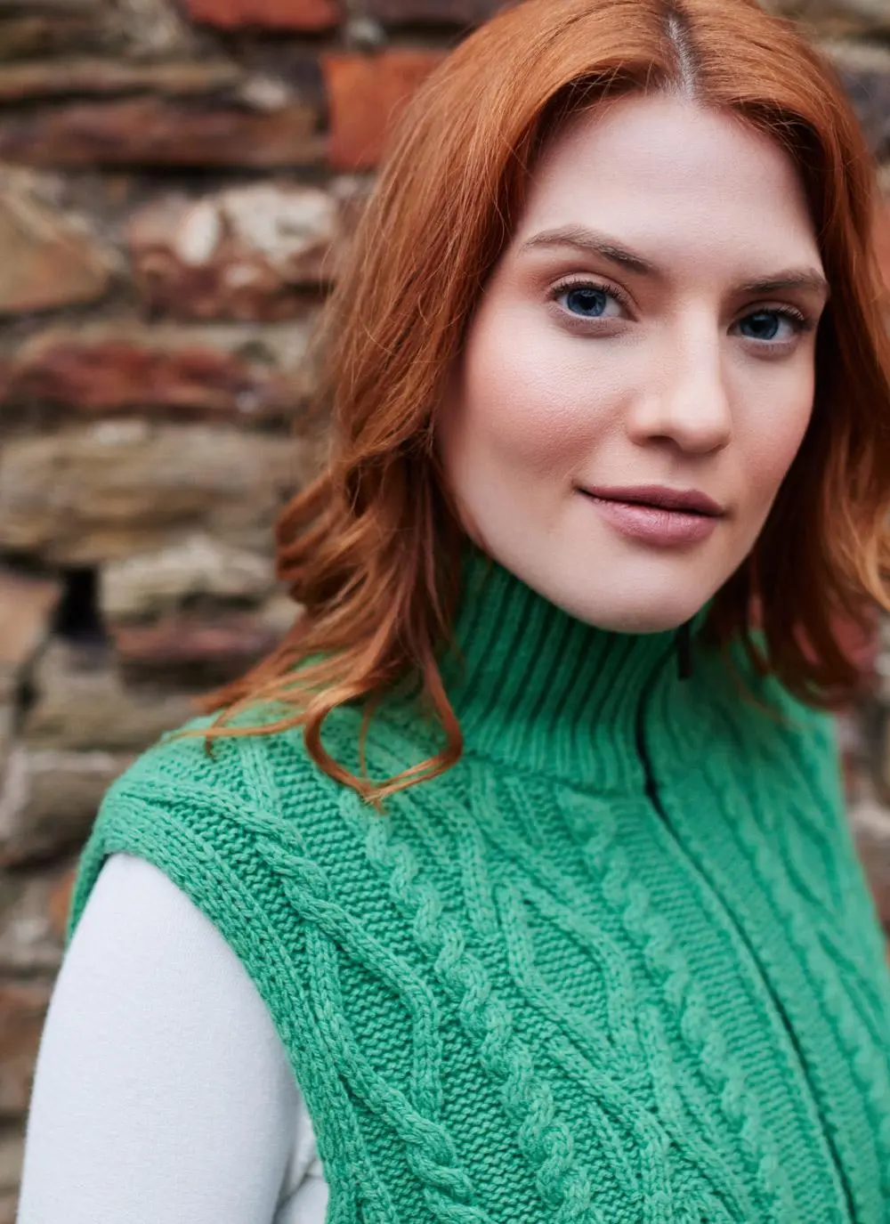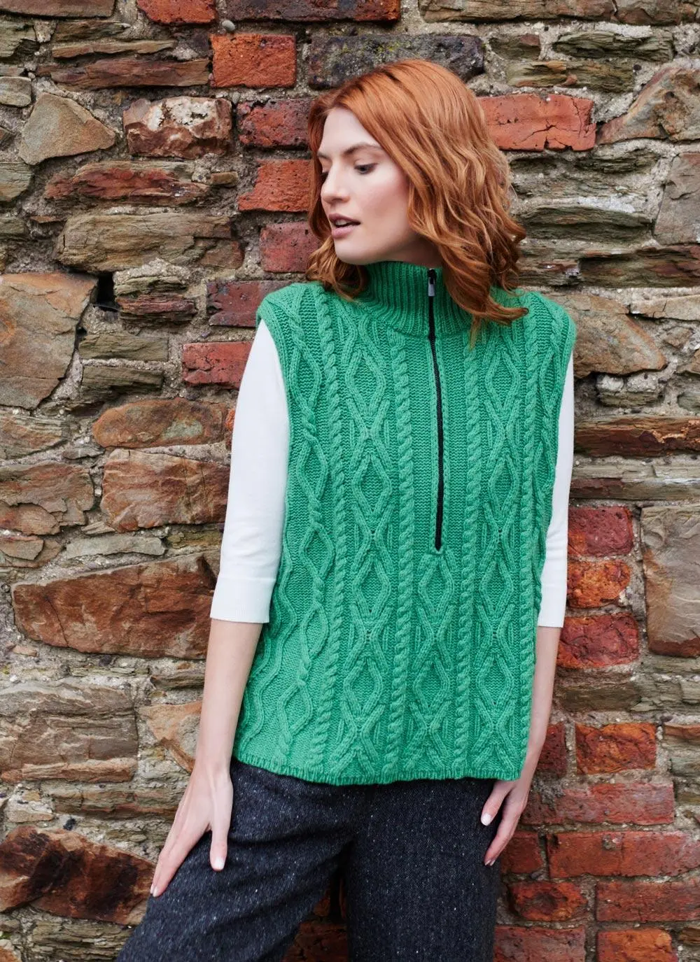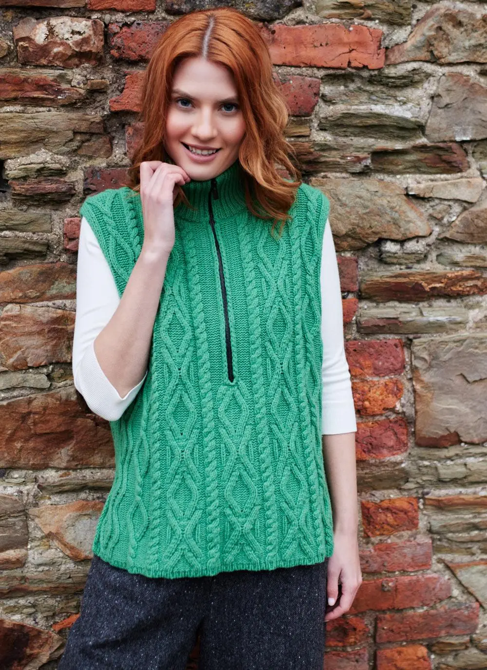 This sleeveless Aran half-zip is a trendy layer with contemporary accents. Knit from the finest merino wool, it features traditional cable and diamond stitching. Thoughtfully finished with two side slits, a dipped hem and a ribbed turtle neck collar for snugness when you need it.