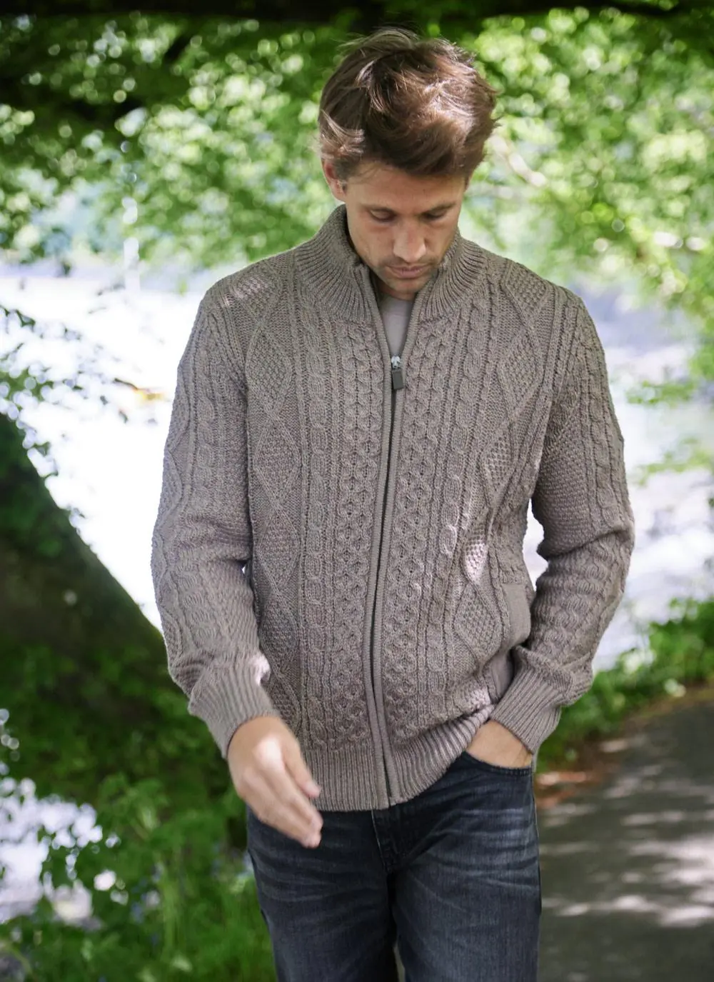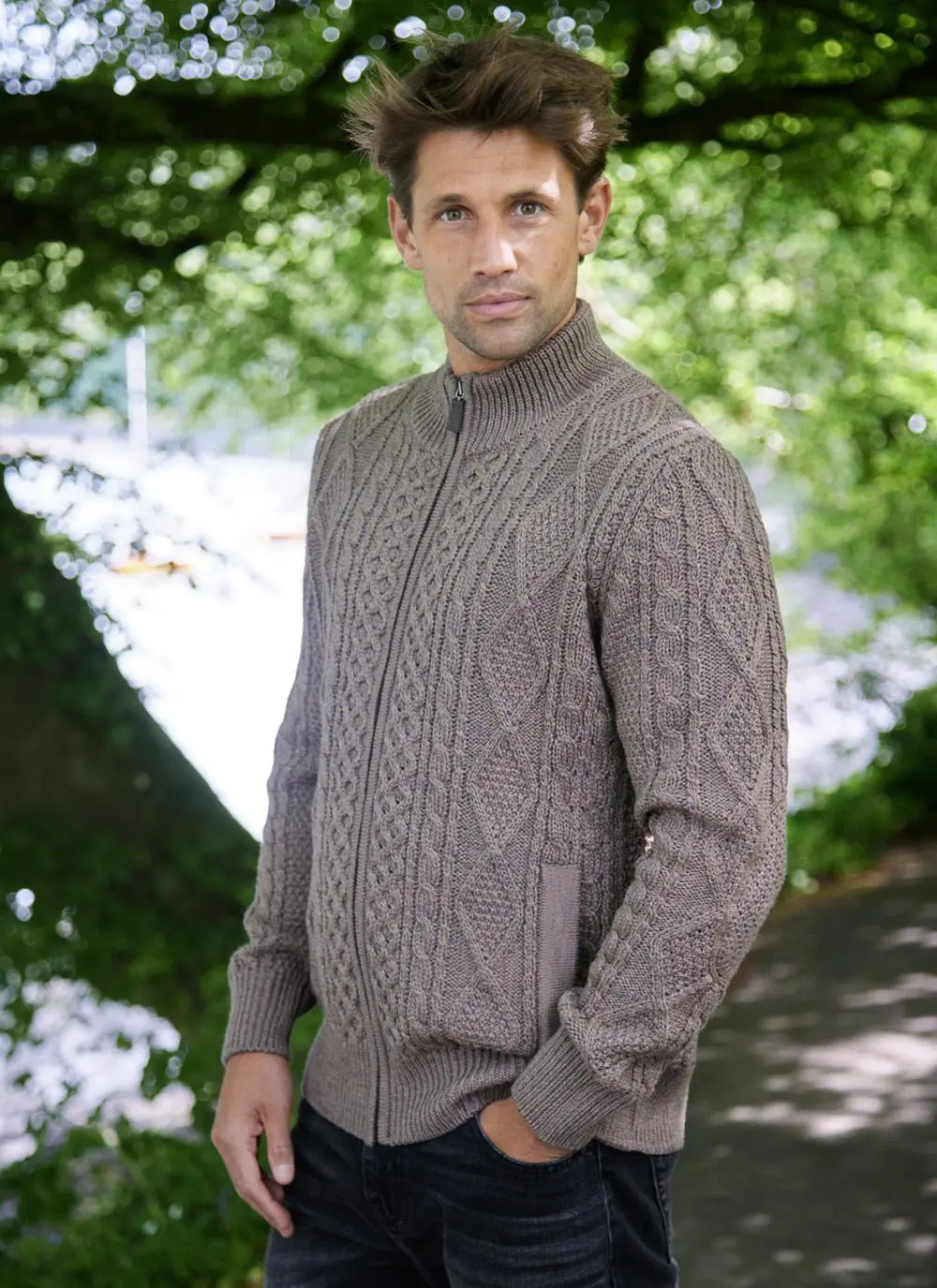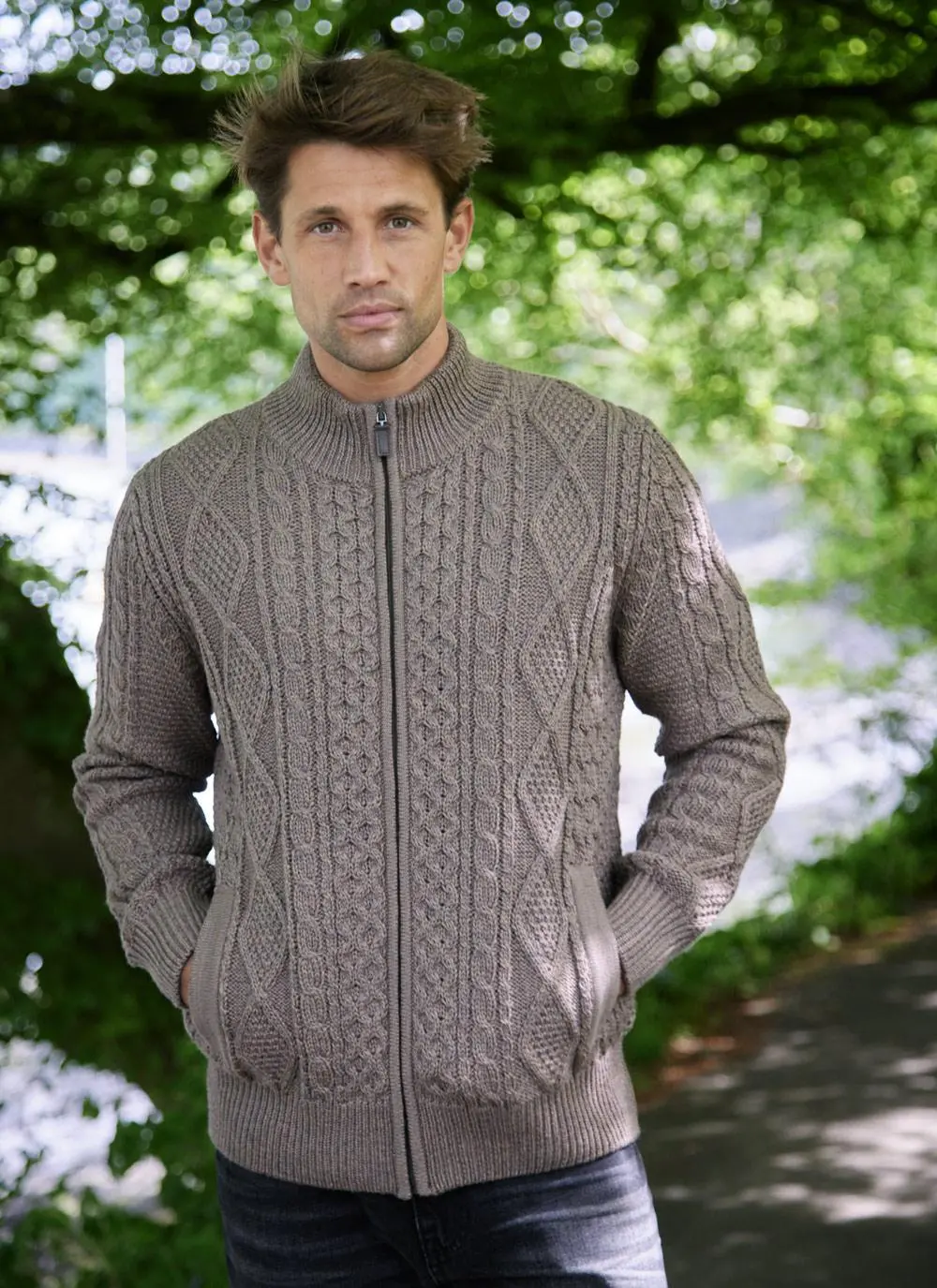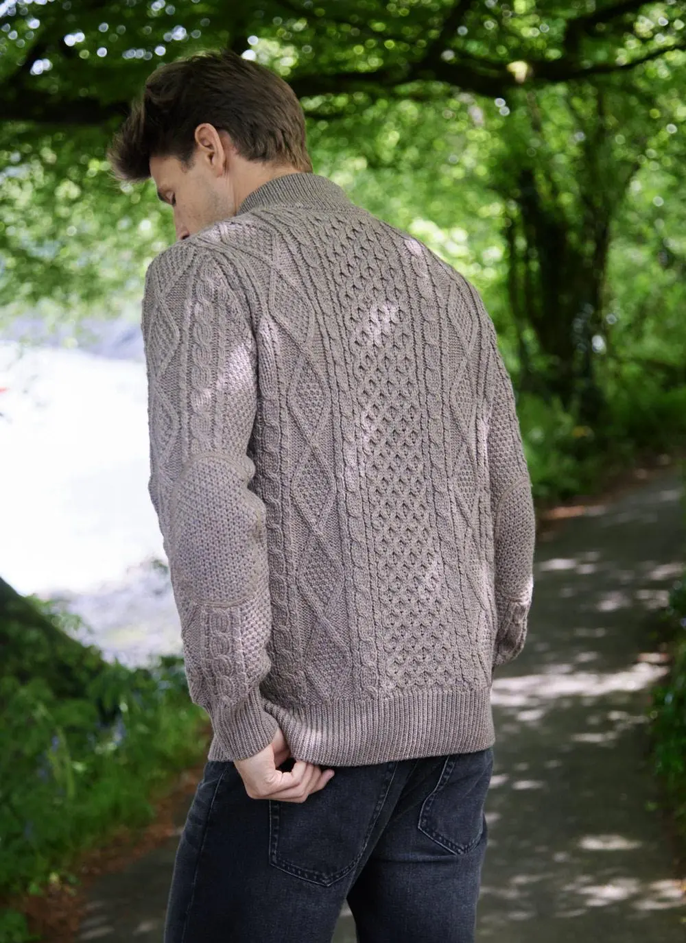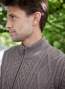 Our Cian Aran cardigan is an Irish knitwear staple. The Aran stitches originated on the rugged Islands off the west coast of Ireland, and are steeped in history and tradition. The full-zip fastening with elbow patches and two functional side pockets are just some of the thoughtful details in our Cian sweater.