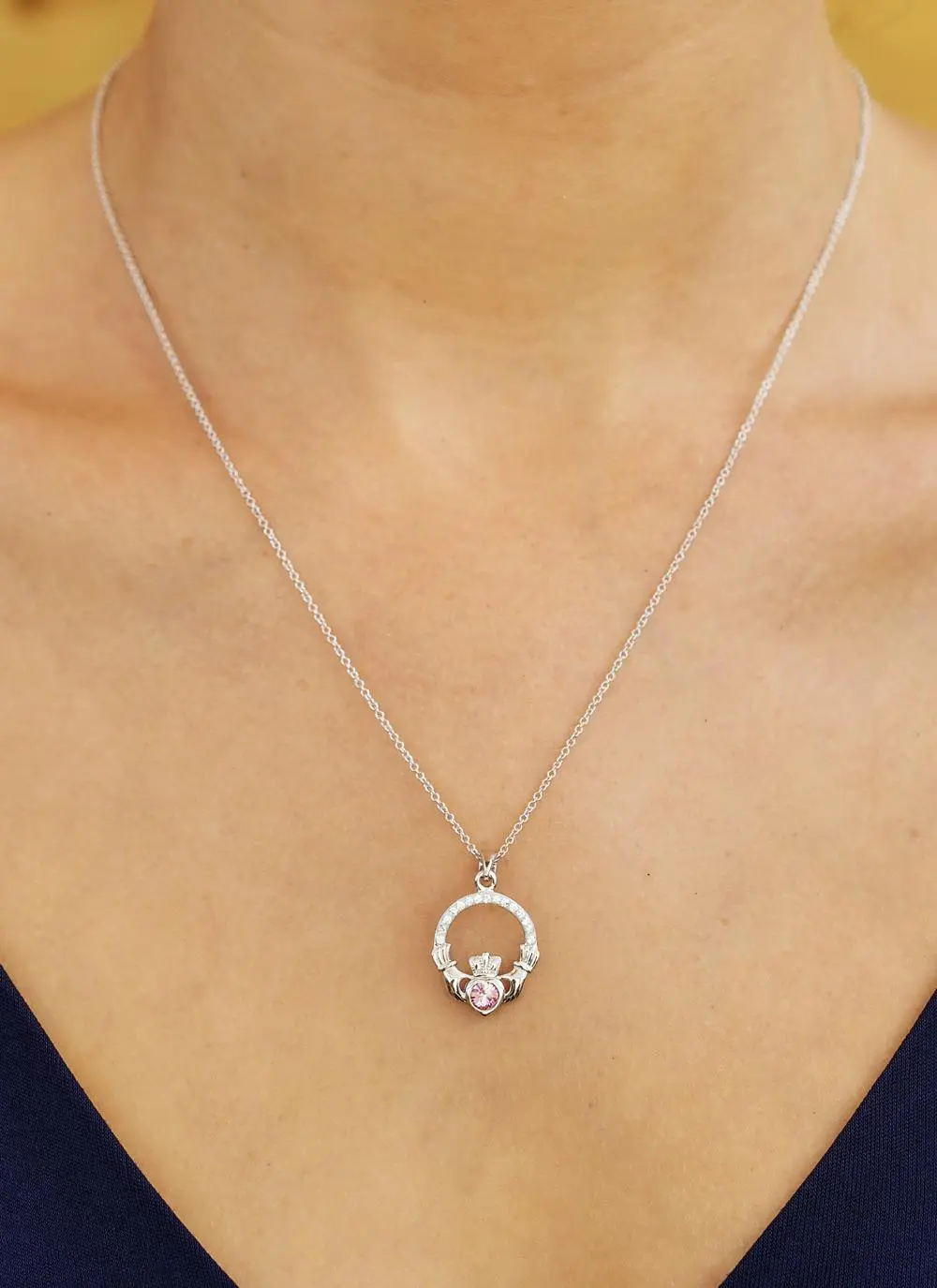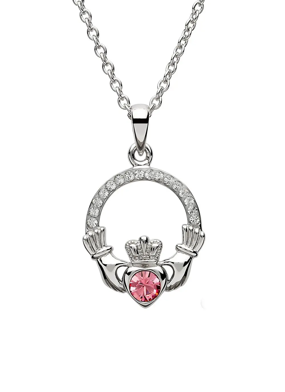 The Irish Claddagh has long been associated with friendship, loyalty and everlasting love. Be a part of the Claddagh story with this sterling silver birthstone pendant. Specially designed for those born in October, the iridescent pink shades embody long and lasting love.