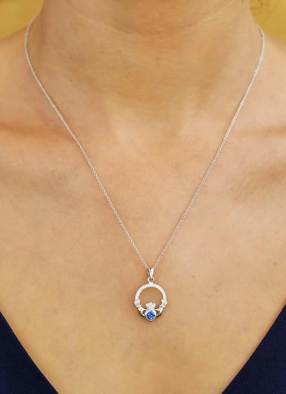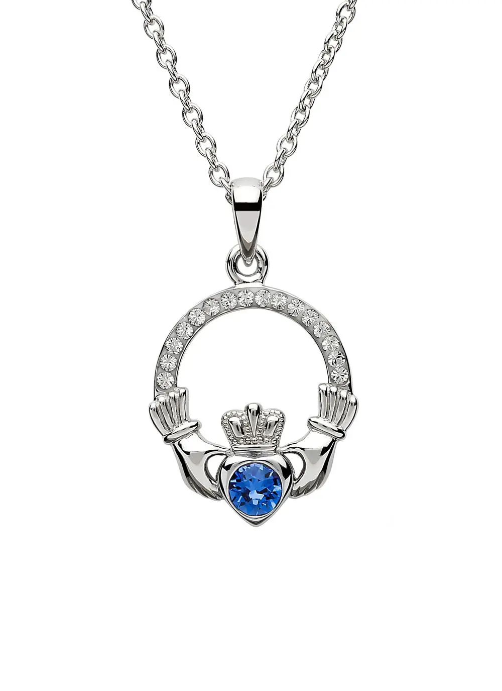 The Irish Claddagh has long been associated with friendship, loyalty and everlasting love. Be a part of the Claddagh story with this sterling silver birthstone pendant. Specially designed for those born in September, the many colors of sapphire symbolize truth, sincerity and commitment.