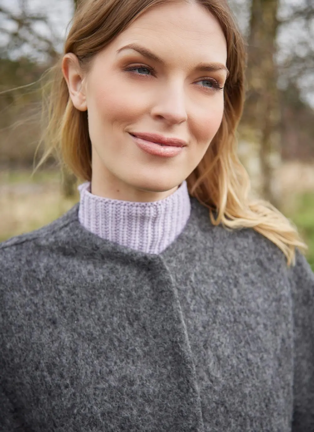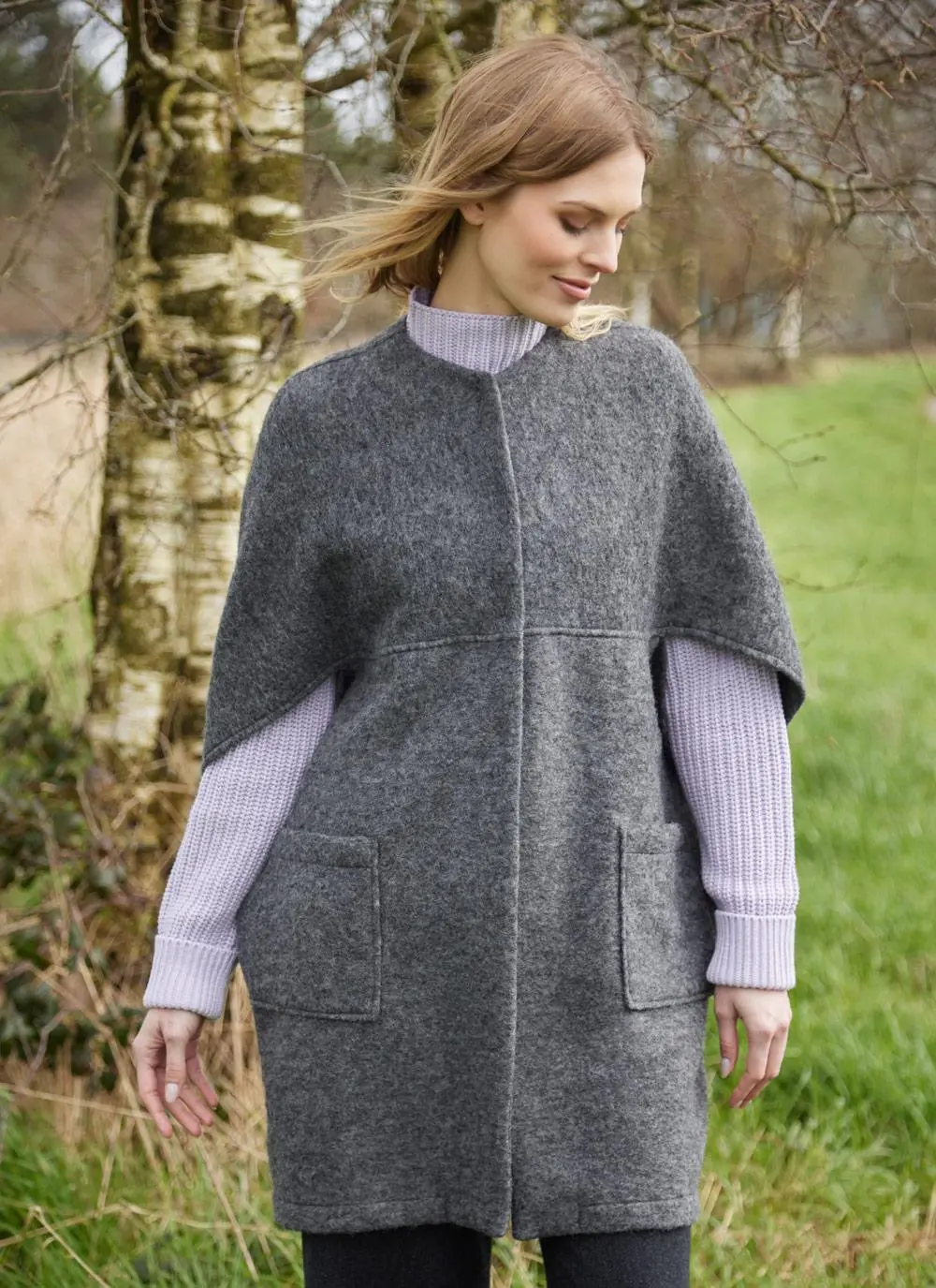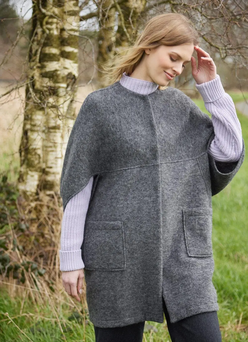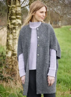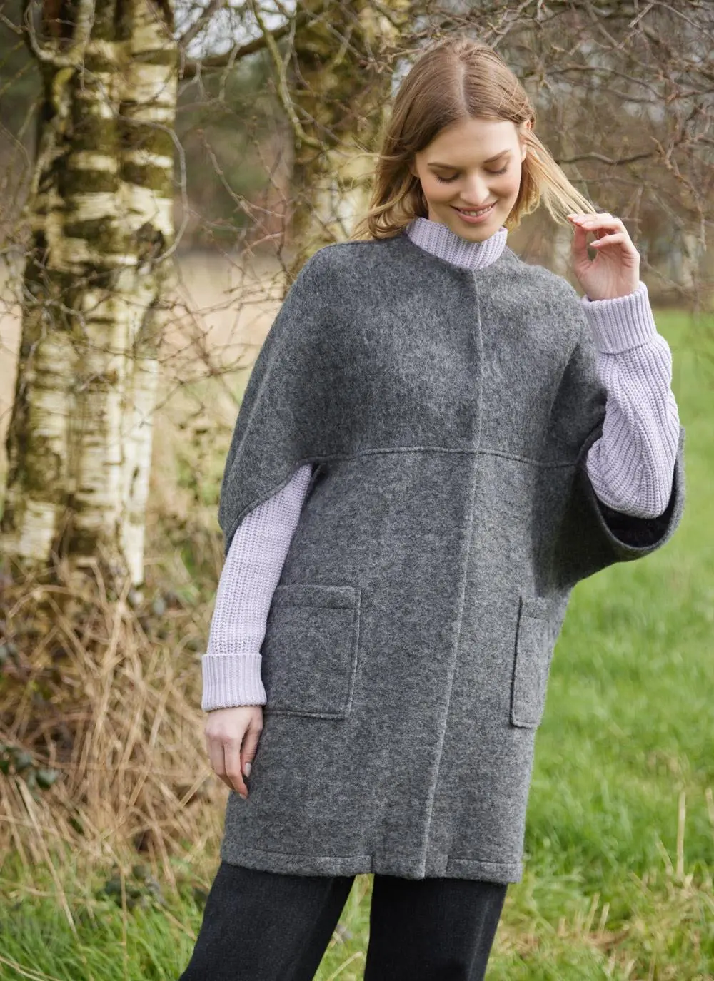 This three-quarter length jacket is enduringly chic. It is beautifully tailored, with an elegant collarless neckline and statement poncho sleeves. Thoughtful finishing touches include two front pockets and four silver snap buttons. A truly effortless layer that will add comfort and sophistication to any ensemble.