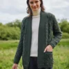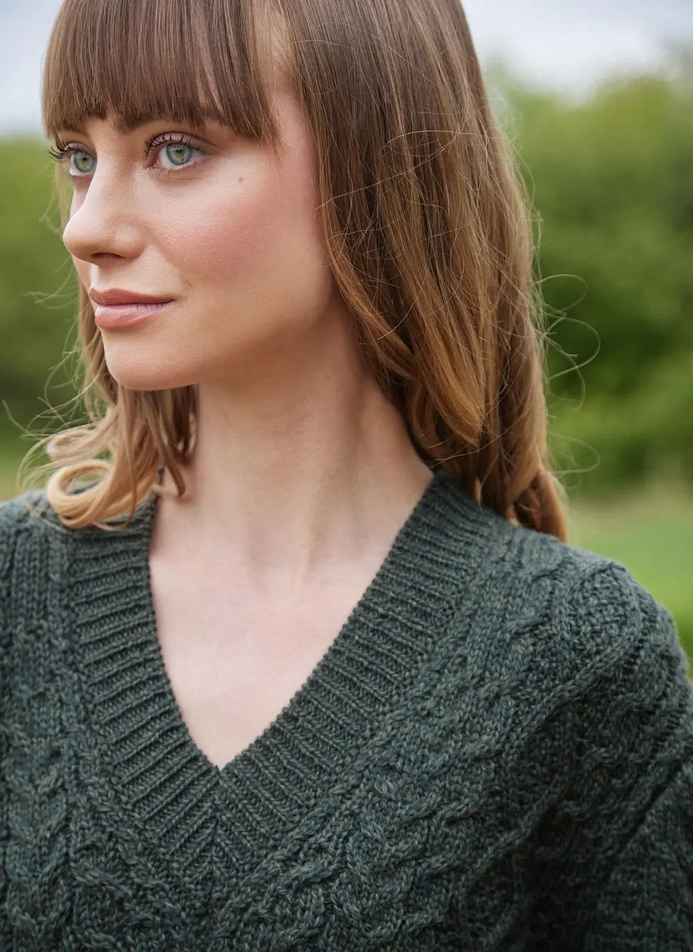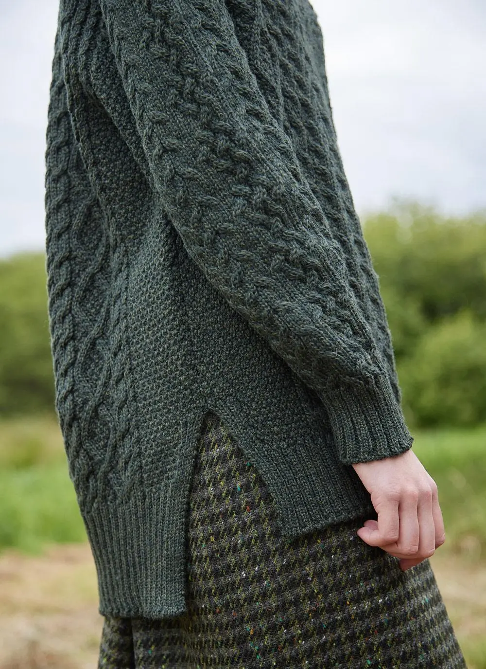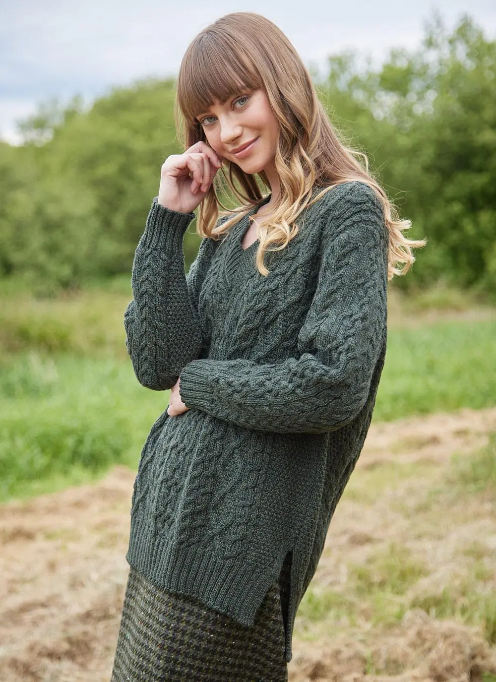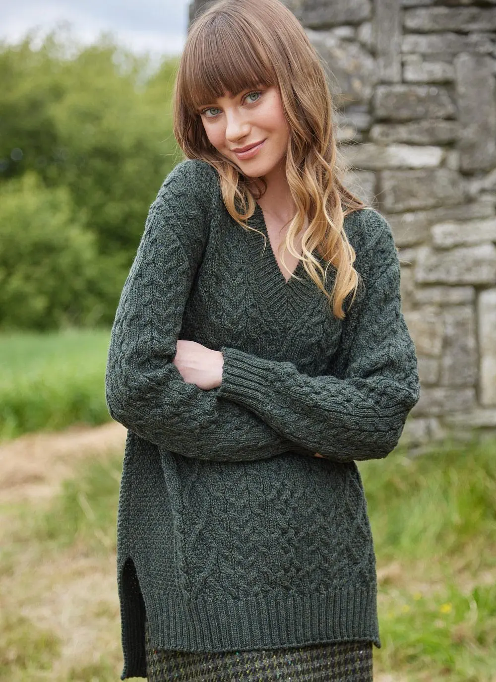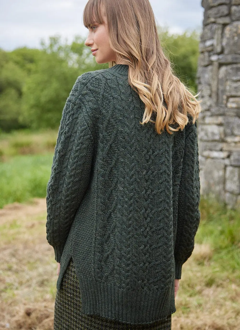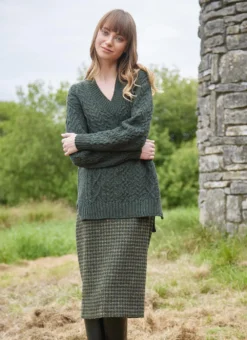 The fishermen from the islands of Inis Mor, Inis Meain and Inis Oírr developed a distinctive style of Irish knitwear in the 19th century that became known as the Aran sweater. Our Cliona V-neck Aran is knit in County Donegal from 100% supersoft merino wool with an all-over cable pattern. Exclusive to Blarney Woollen Mills, it is finished with a trendy dipped hem and side slits, with ribbed trims and a modern v-neckline.