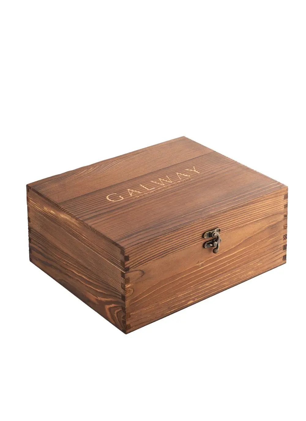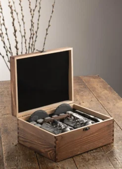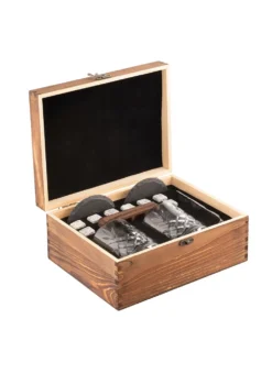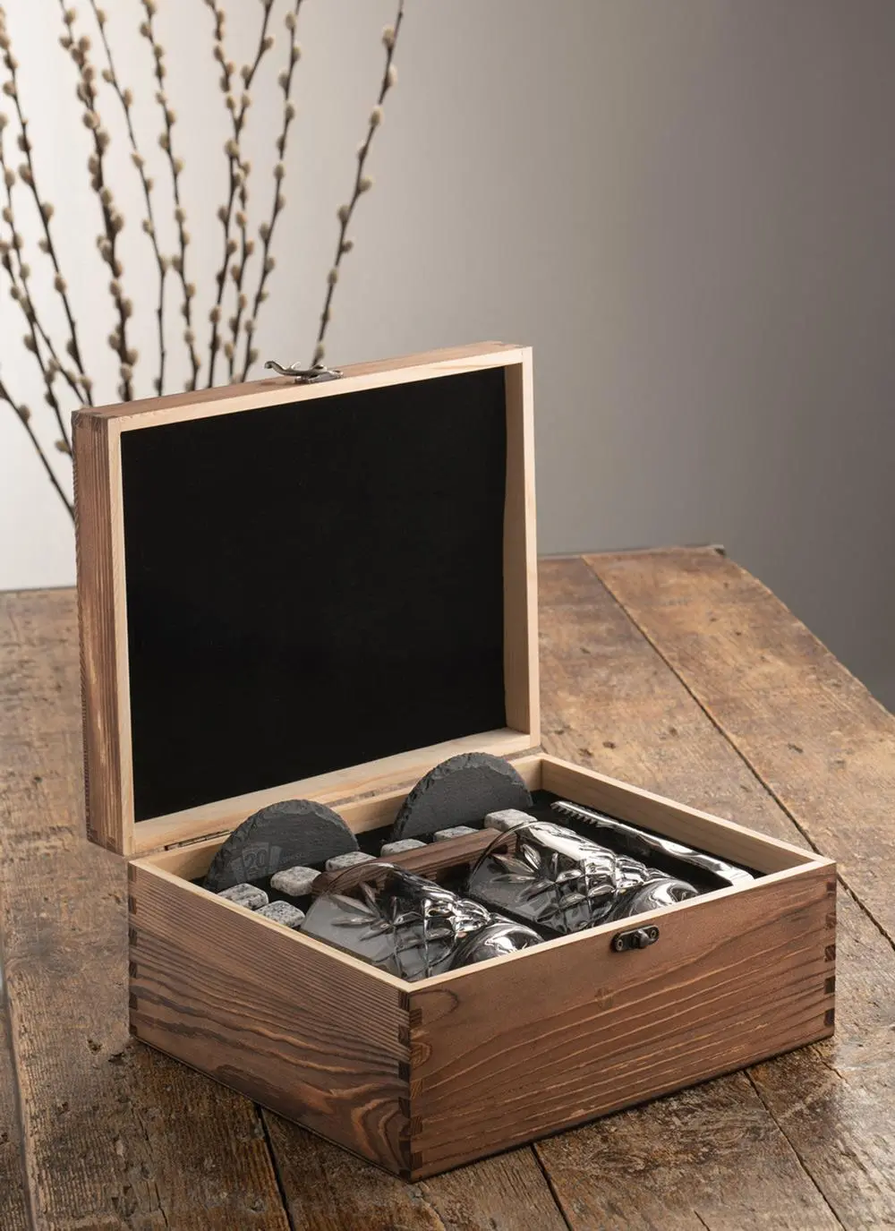 Treat the whiskey connoisseur in your life to this gift set, complete with everything you need to make the most of every sip. It includes two Renmore lowball glass tumblers cut with an intricate diamond pattern. Also included are whiskey stones to keep your beverage cool without diluting it, as well as coasters and tongs. Beautifully presented in a wooden box that can be used for easy storage.
