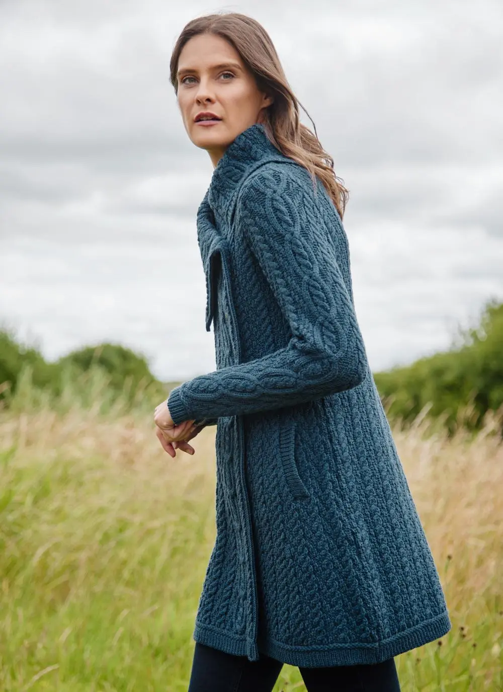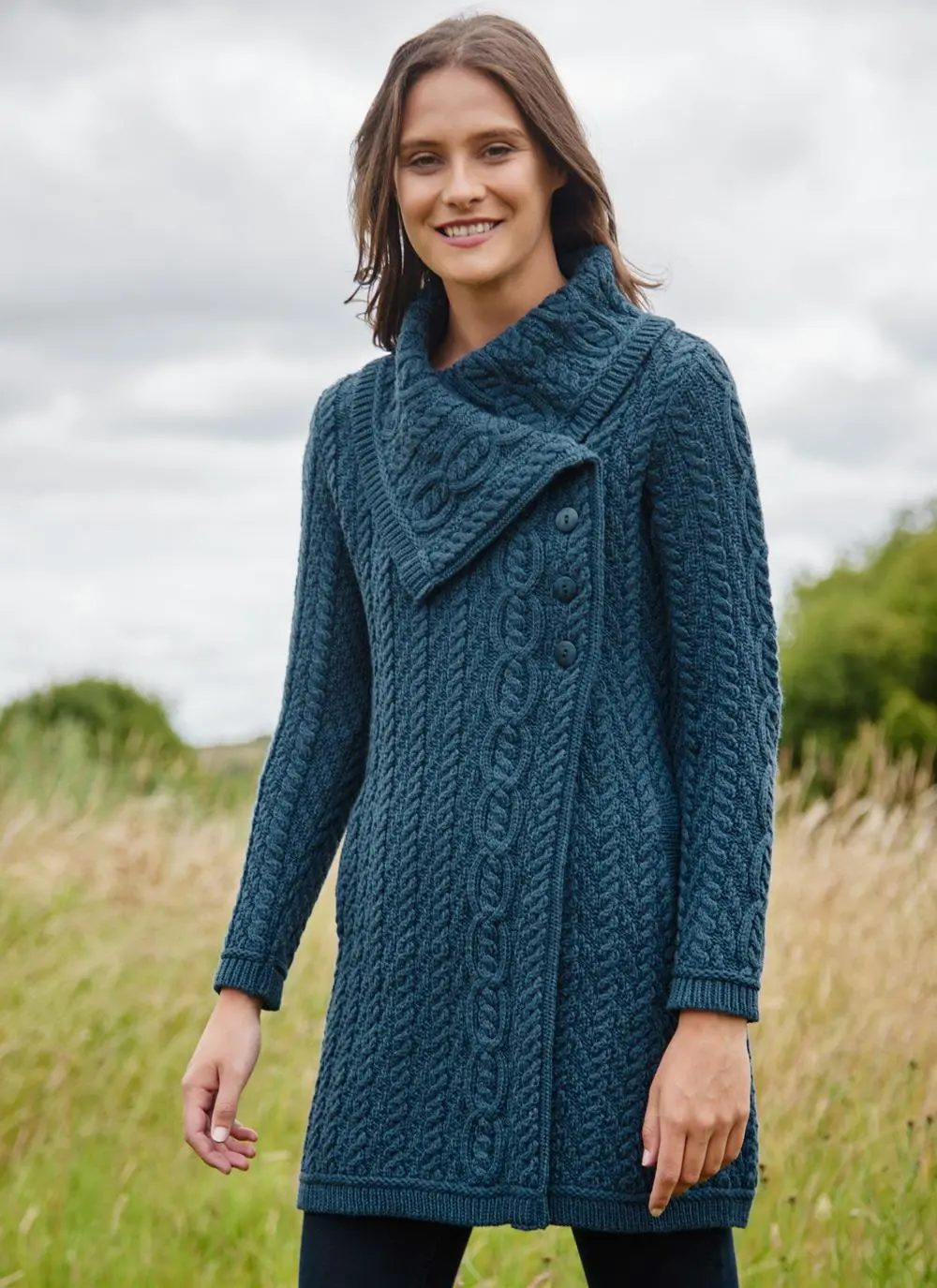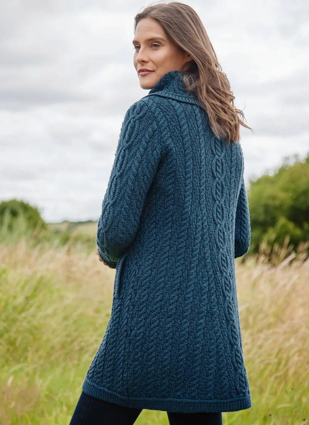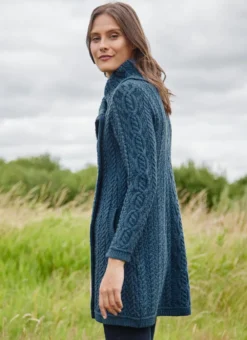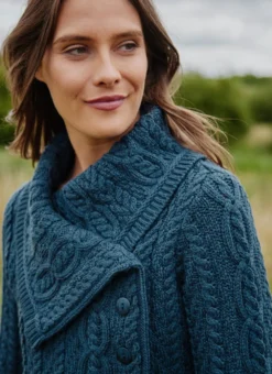 Knit with the finest sustainable merino wool, this Aran coatigan will keep you cozy and comfortable outdoors. The classic cable stitching draws the eye to its statement chunky collar which adds style and warmth. Universally flattering, this coatigan has a neat fit and 3/4 length for an elegant finish.