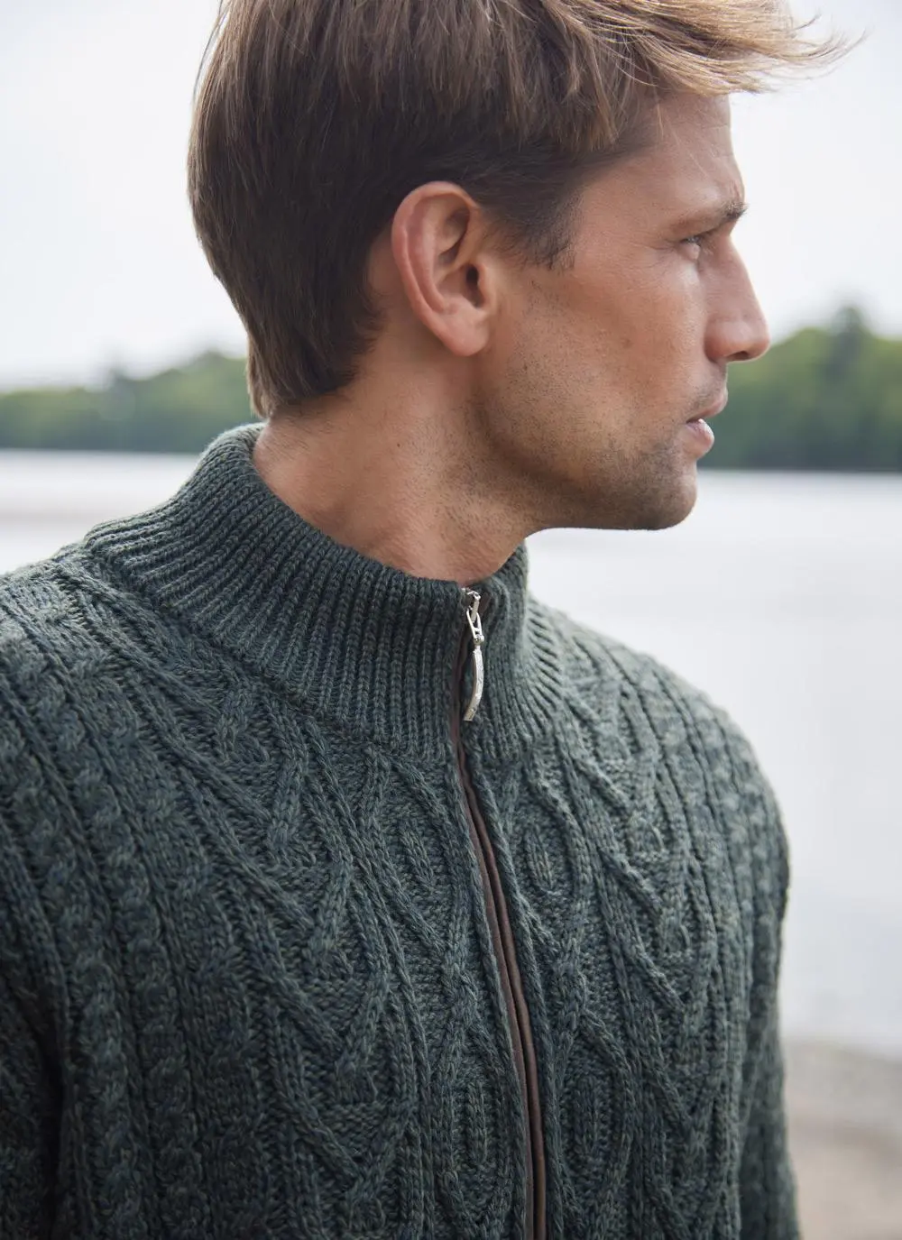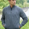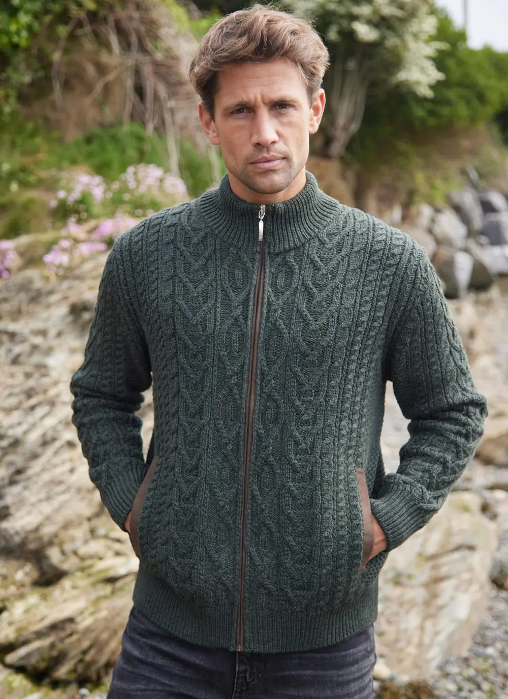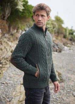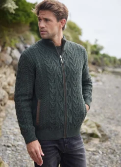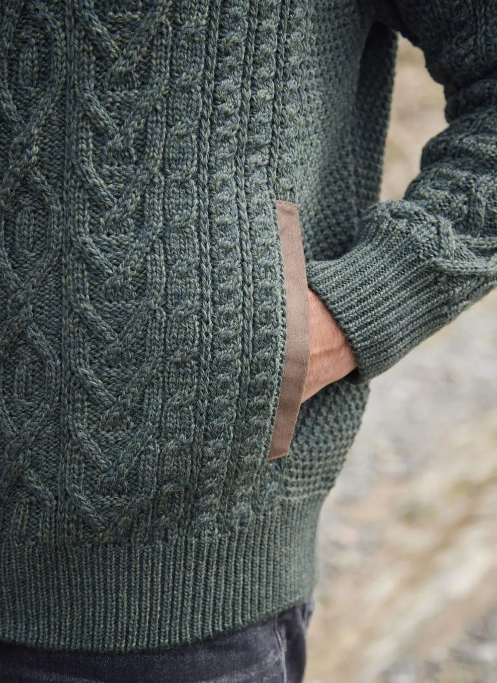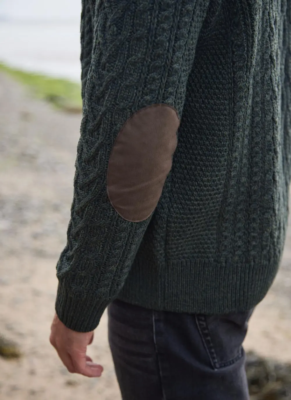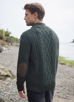 Traditional Aran stitches enjoy a beauty all of their own, which is perfectly captured in our Eoin cardigan. It features effortless full-zip fastening with a high ribbed collar and two functional side pockets. The cardigan has suede trims and distinctive elbow patches. Knit with soft and sustainable merino wool whose quality will withstand the test of time. Our timeless Eoin Aran cardigan is exclusive to Blarney Woollen Mills.