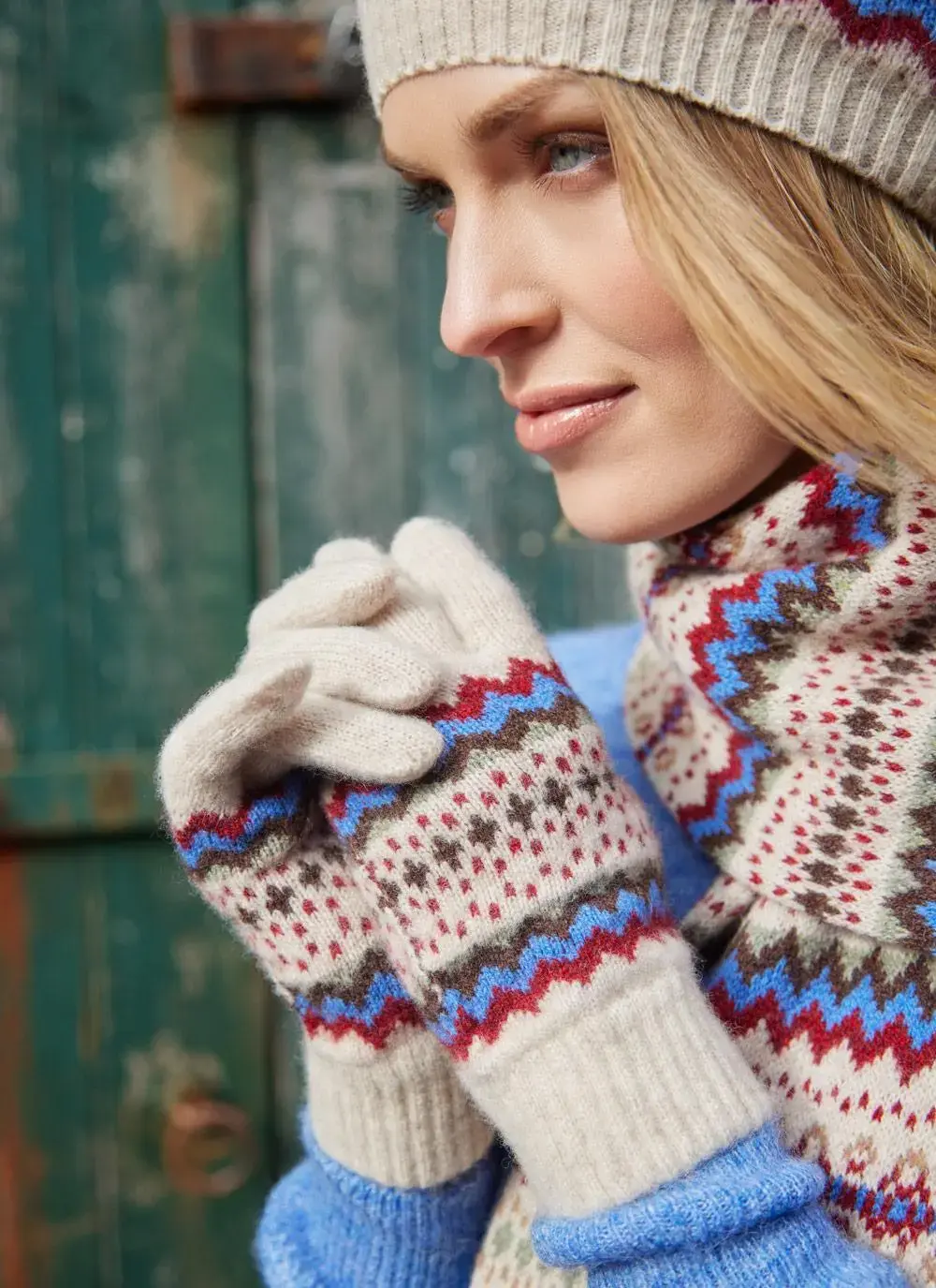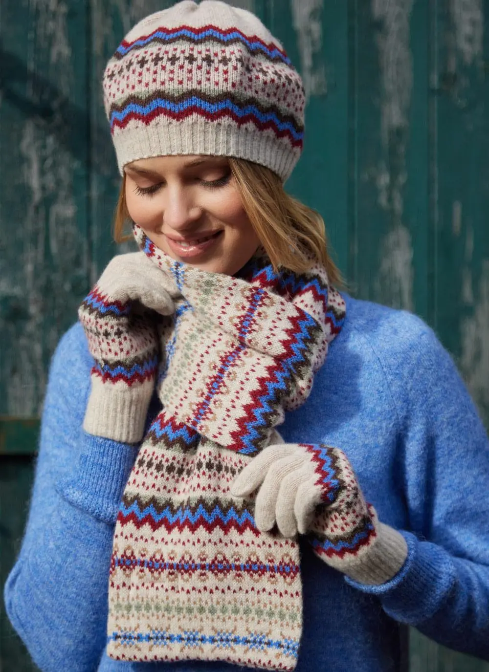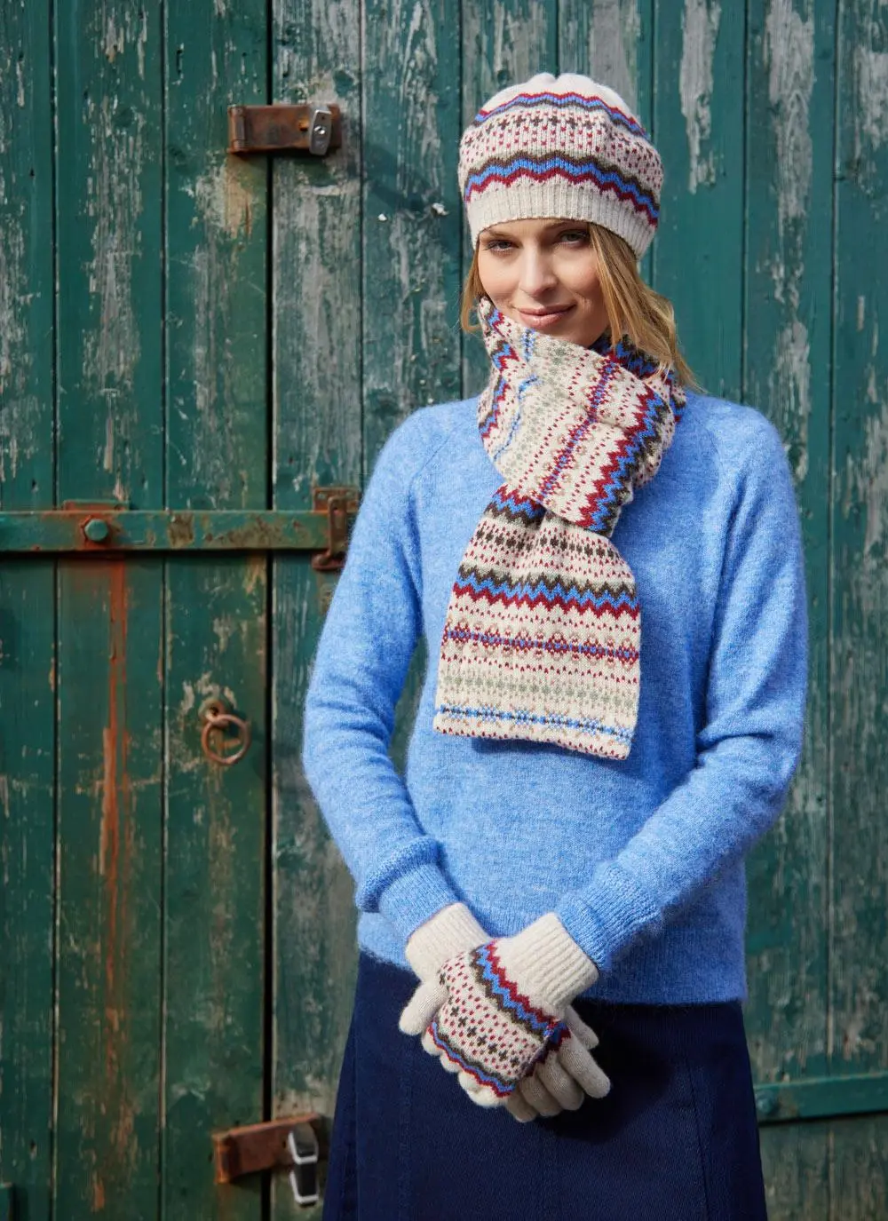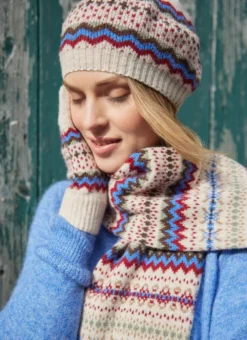 Make a stylish statement this winter with this beautiful Fair Isle beret, scarf and gloves set. Each piece in this matching trio is knit with pure new wool, keeping you warm and cozy when the chill sets in.