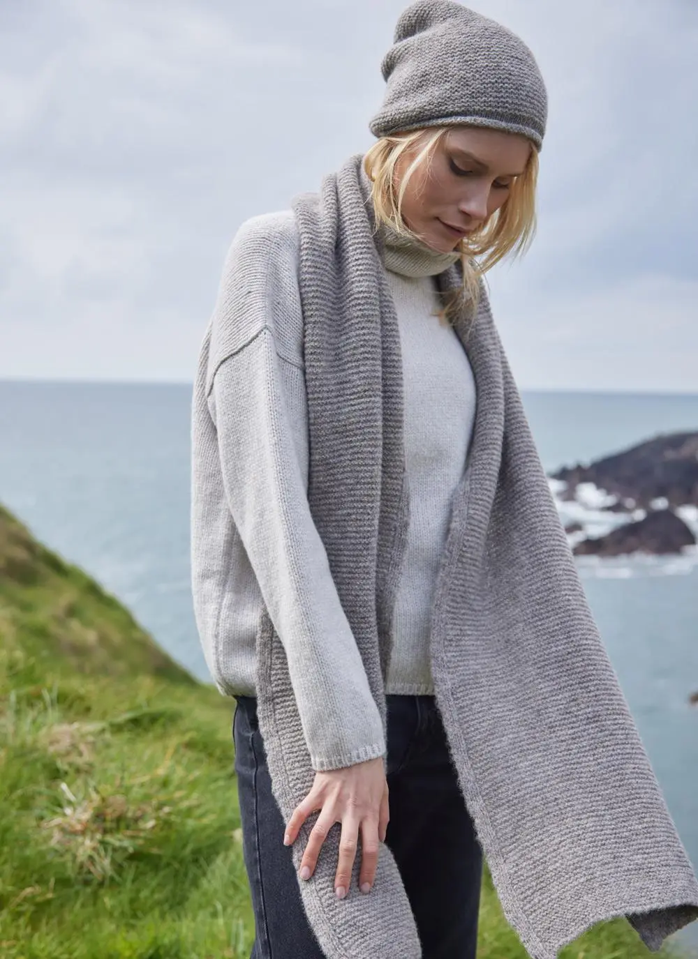 This wide, link stitch scarf by Fisherman Out of Ireland is knit in a super-soft baby alpaca and highland wool blend. Made in Donegal, this stylish and versatile accessory is perfect for layering in cooler temperatures.