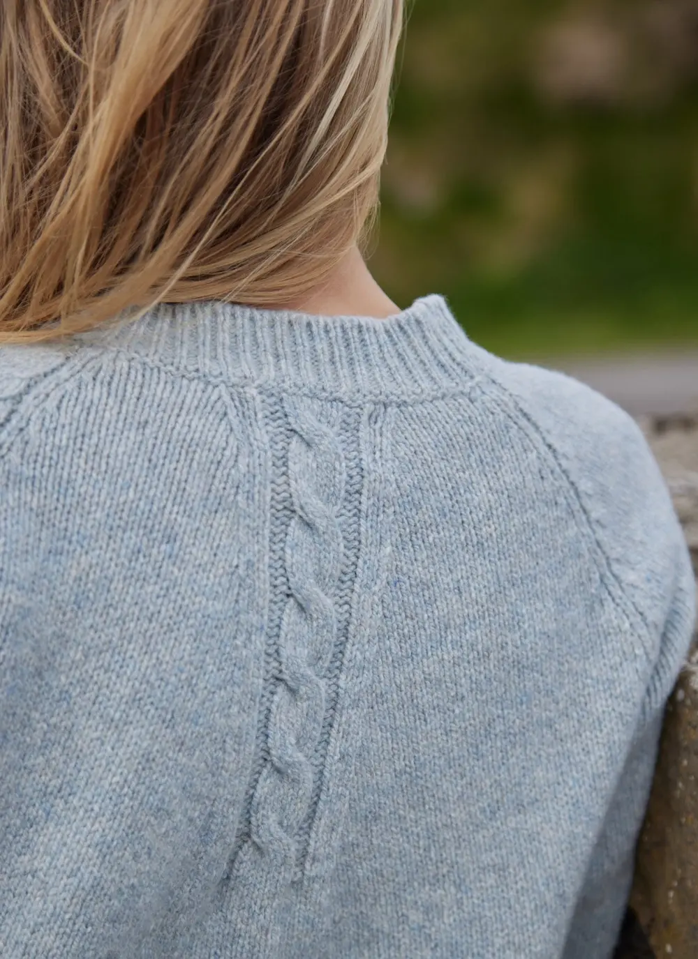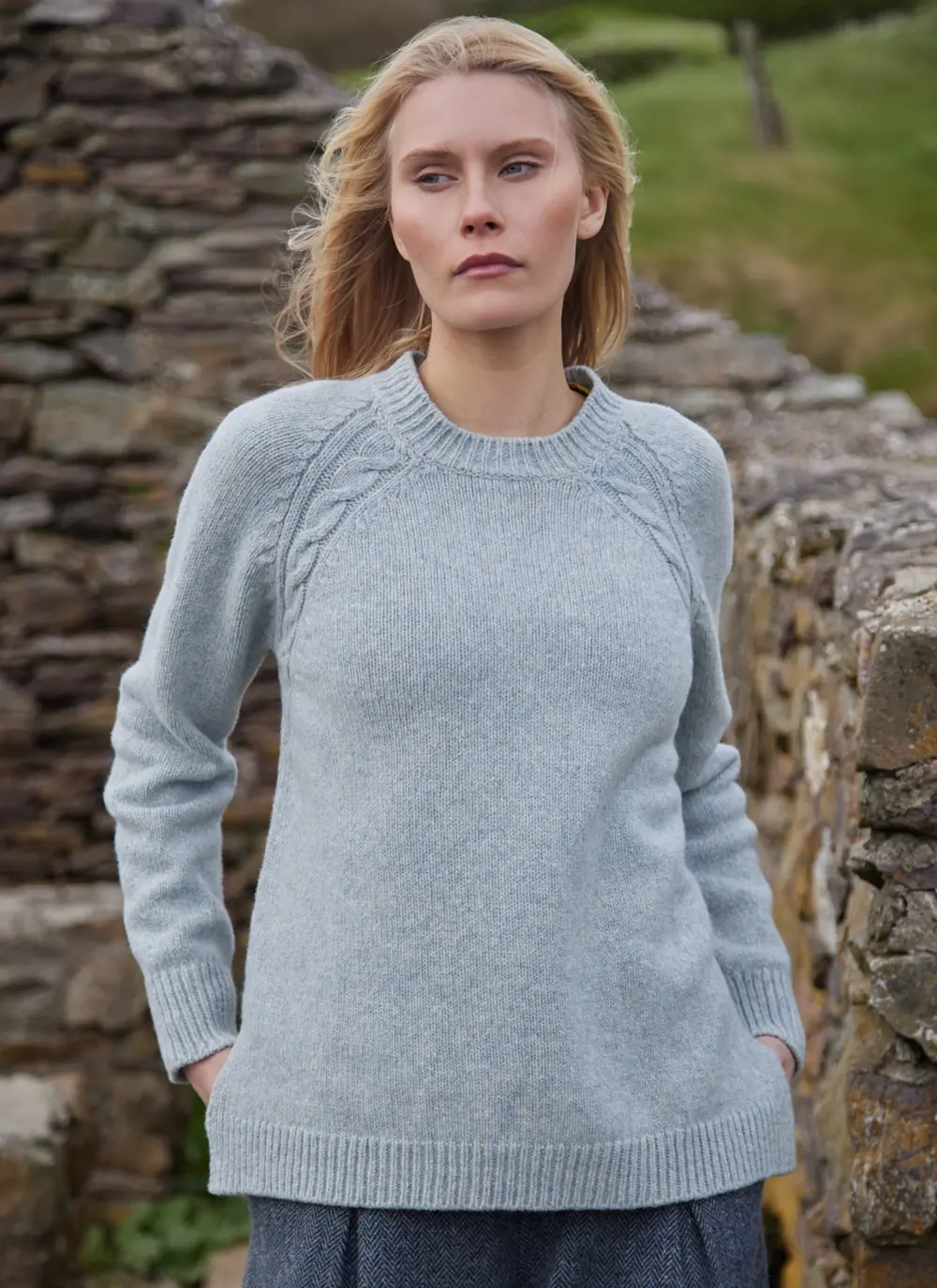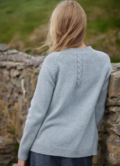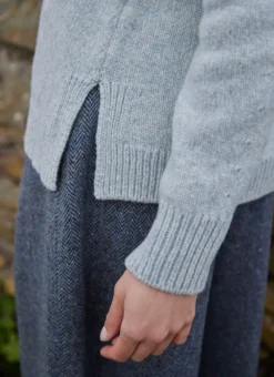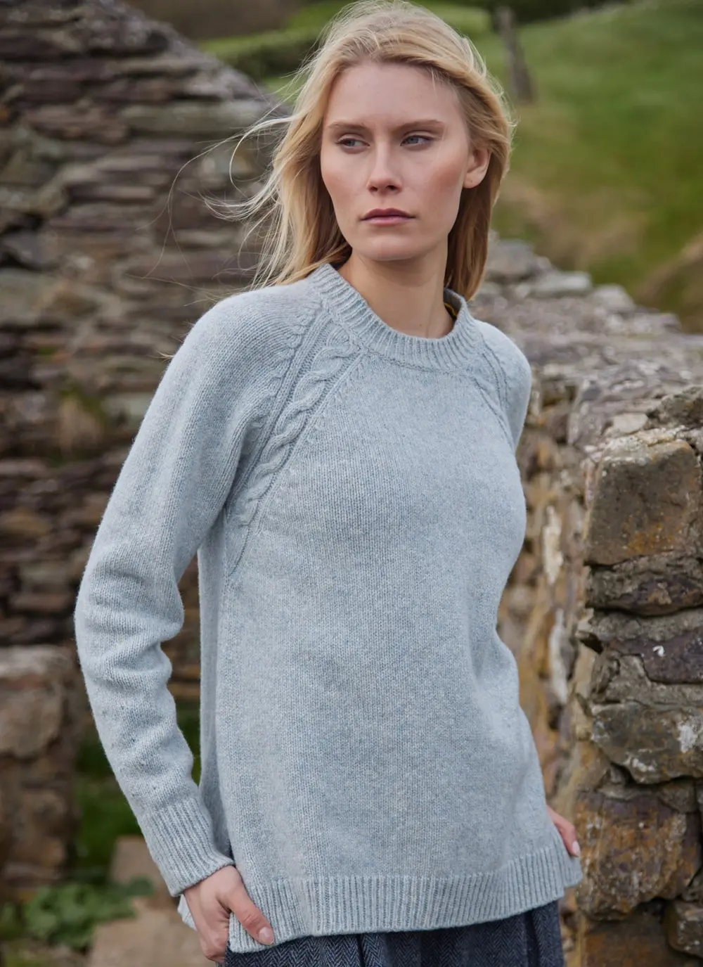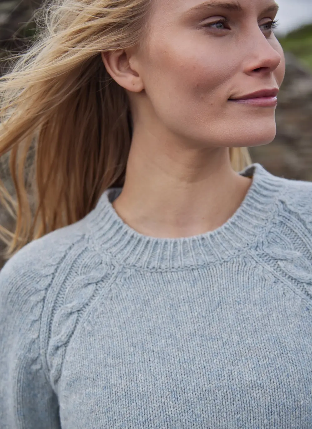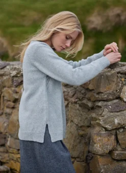 Simple with distinctive finishing touches, this sweater by Fisherman Out of Ireland is effortlessly stylish. It is knit sustainably with a luxurious blend of cashmere and mulesing-free merino wool which gives a marled, tonal effect. Accents include raglan sleeves with cable stitching, two side slits and ribbed edges.