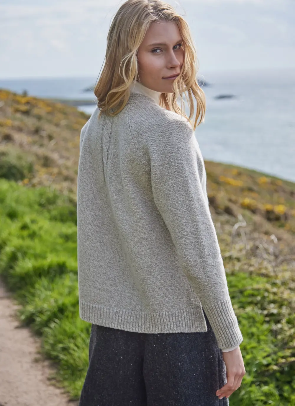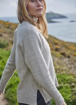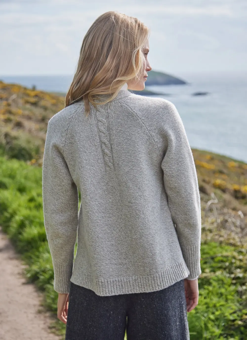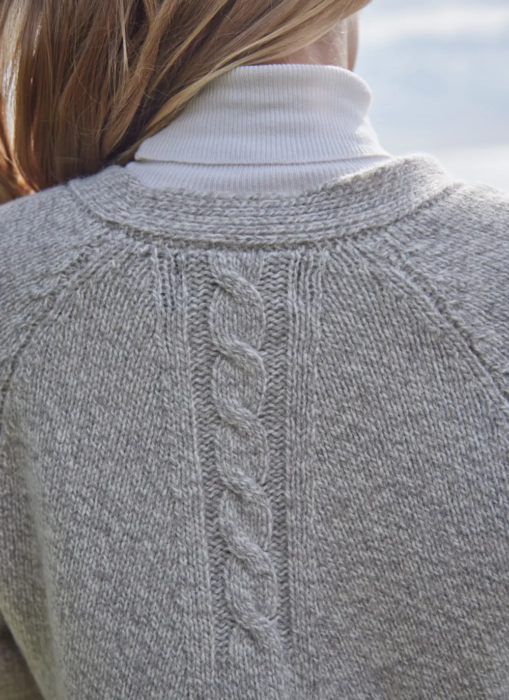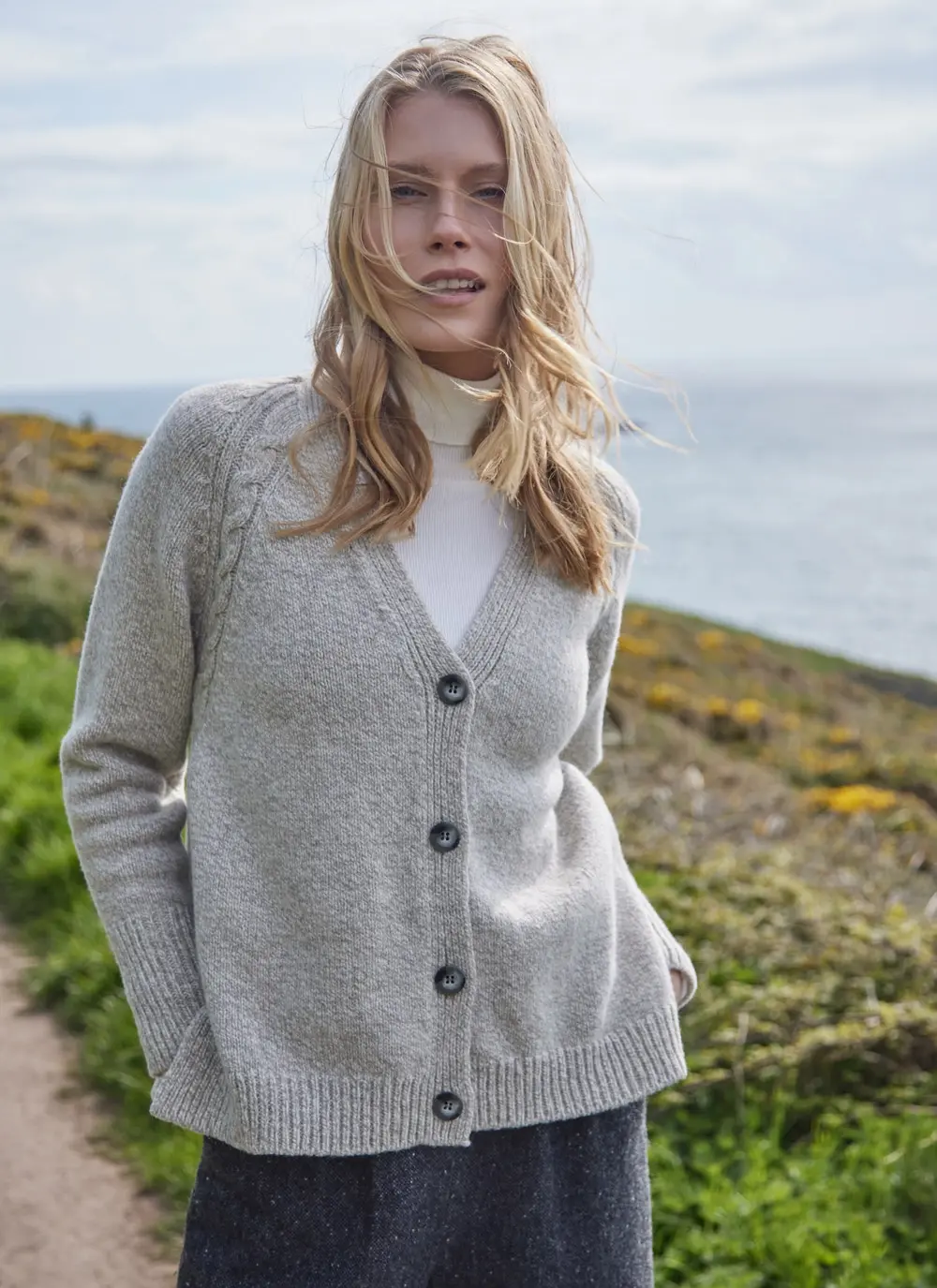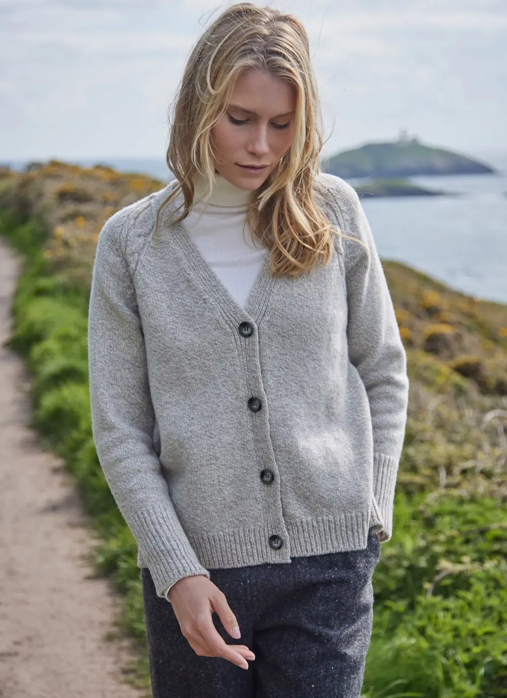Made in County Donegal by Fisherman Out of Ireland, this contemporary yet easy-to-wear cardigan features a distinctively slouchy silhouette. It is beautifully detailed with with cable stitching, two side slits and raglan sleeves.  A blend of cashmere and merino wool creates an exceptionally soft hand feel.