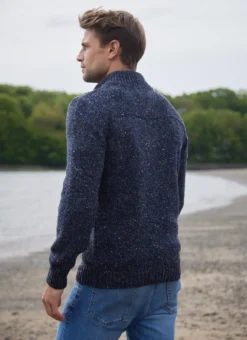 This half-zip sweater by Fisherman Out of Ireland is knit in Donegal using sustainable, mulesing-free Merino wool. Classic yet contemporary, it features ribbed stitching along the hem, neckline and cuffs. The fleck yarn captures the many colors of the magnificent Donegal countryside.