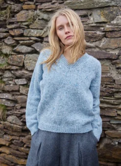 Timeless and effortlessly stylish, this v-neck sweater is a casual knitwear staple. It is knit in Kilcar in County Donegal with Fisherman’s signature mulesing-free merino wool. A contemporary sloped back hem adds an understated yet distinctive finishing touch, and the Donegal fleck yarn reflects the natural colors of Ireland’s rugged landscape.