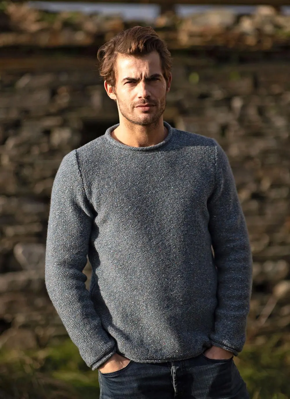 This Fisherman Out of Ireland crew neck sweater is semi-felted with roll edges. It is knit with sustainable mulesing-free merino wool and cashmere which has a multi-tonal effect. Made by our superb craftsmen and women in County Donegal.Â