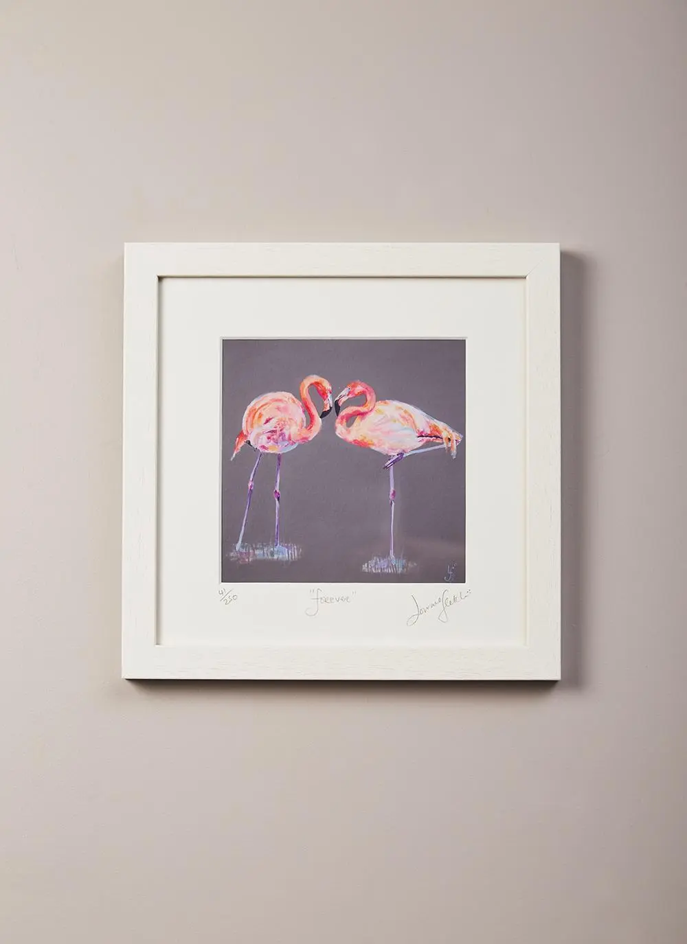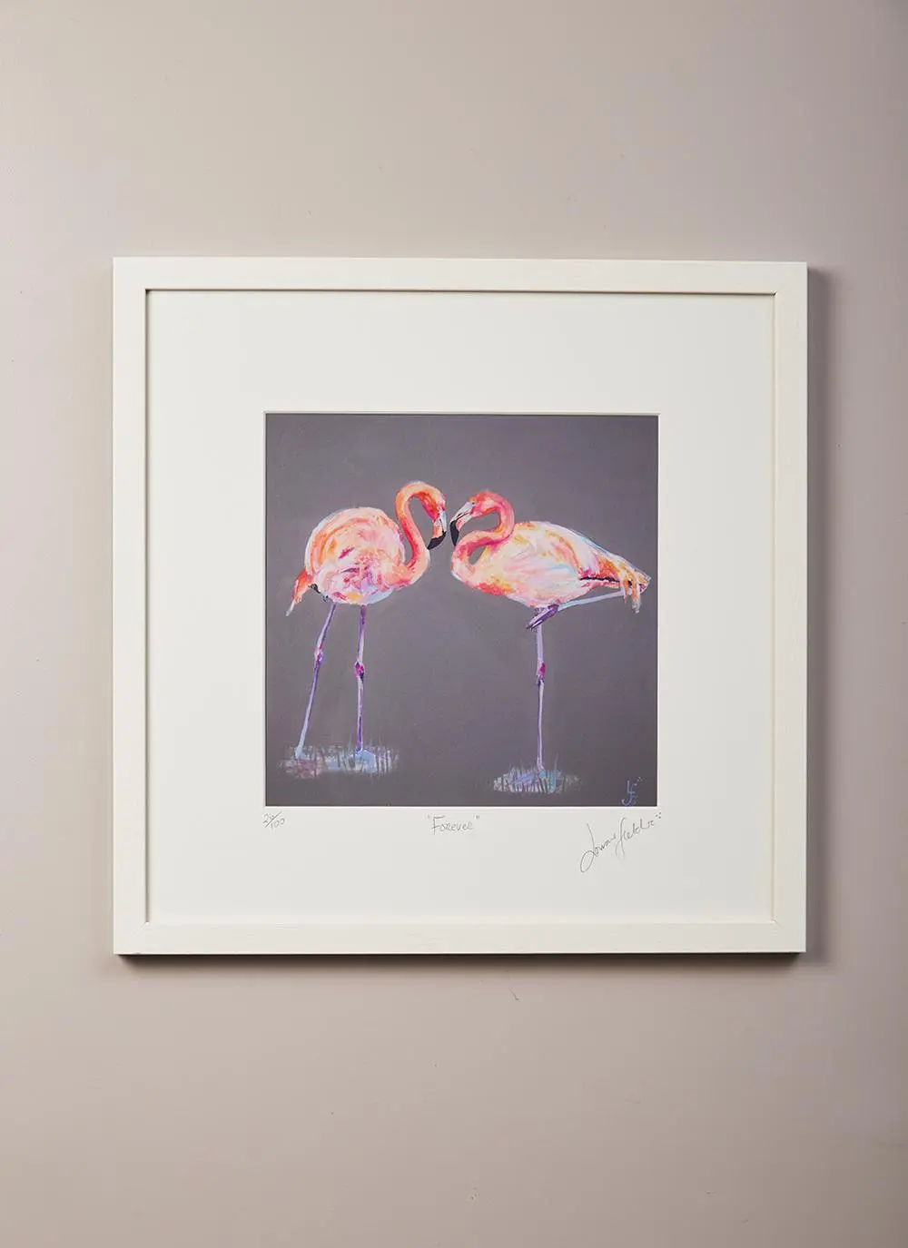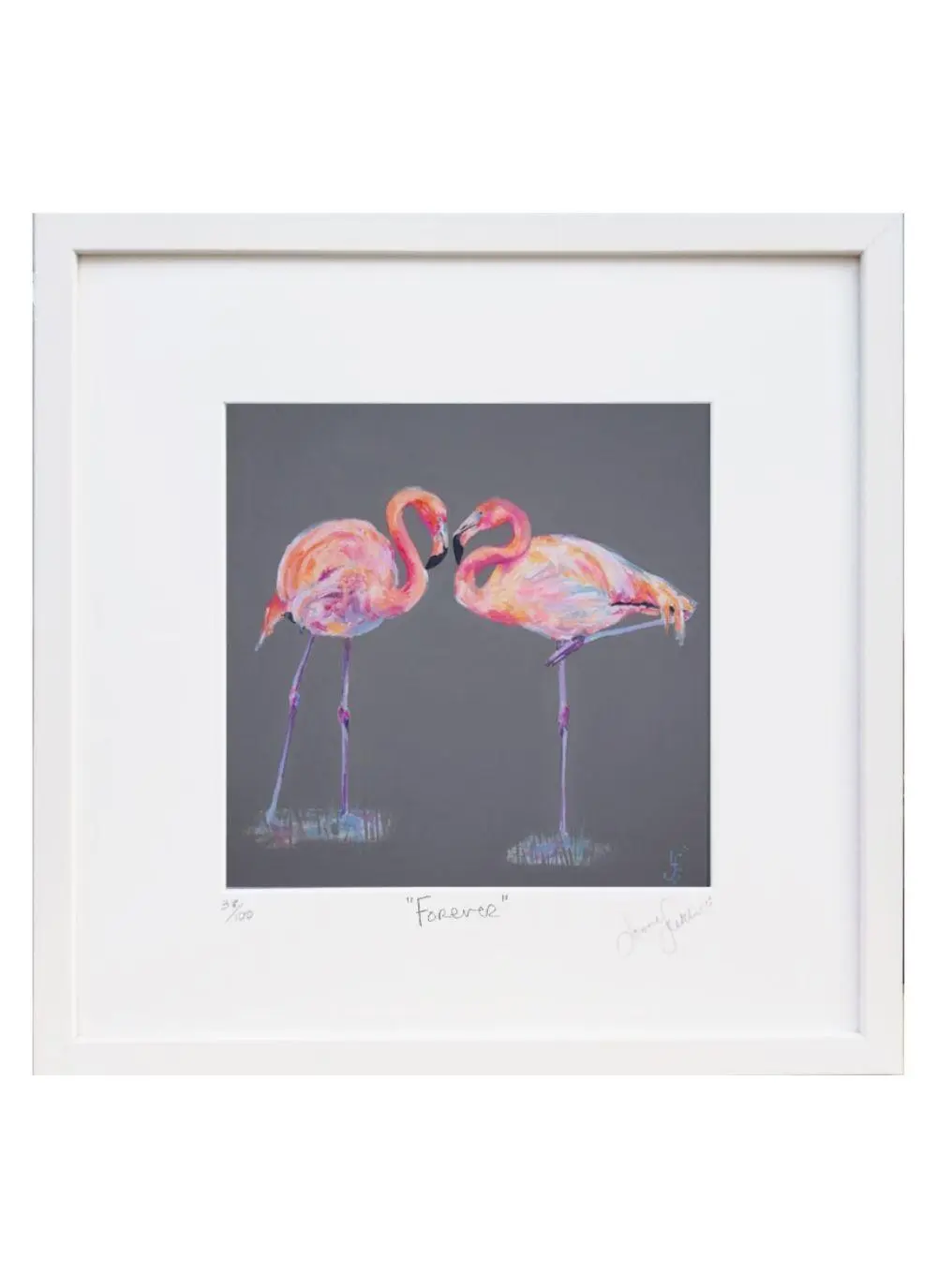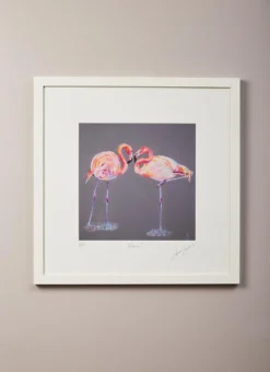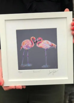 This limited edition print shows a loving and tender embrace between a pair of flamingos. Their heads and neck come together to form a love heart shape. A wonderful Irish gift for those who have just become engaged or married.