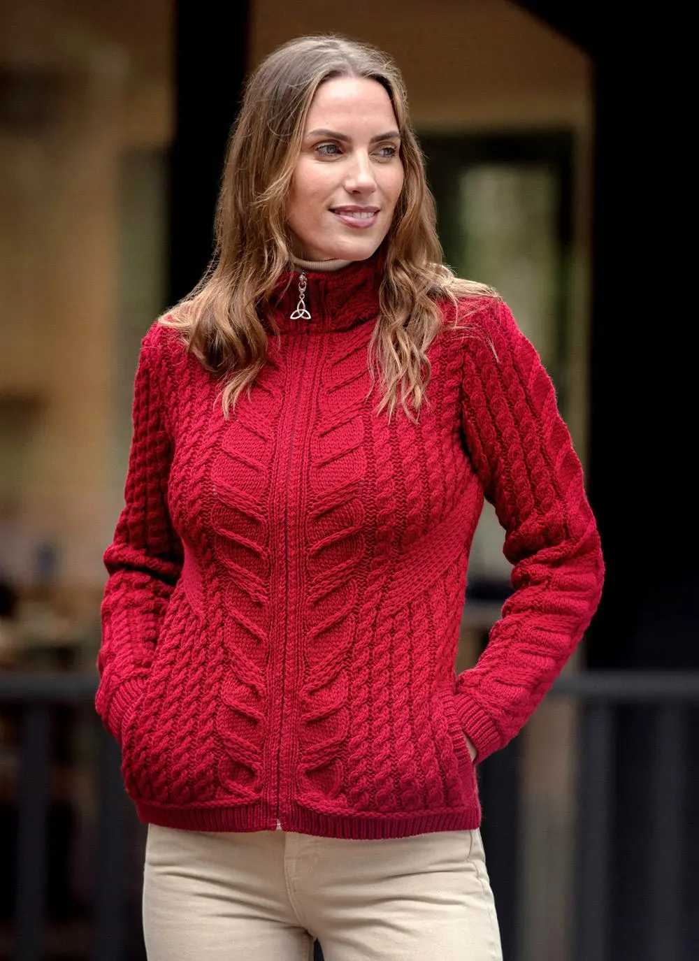 Made in Ireland with traditional Aran cable patterns, this zip cardigan is an authentic piece of Irish knitwear. It has a gorgeous flattering silhouette thanks to its slightly fitted shape which is accentuated by curved stitching above the waist. Merino wool is the ideal fabric choice for those seeking warmth, quality and sustainability. Designed with a beautiful attention to detail, it is finished with a Celtic Trinity Knot zip pull whose three intersecting loops symbolize never-ending life and love.