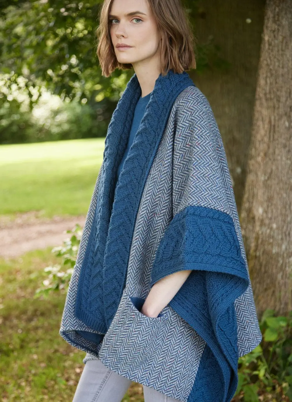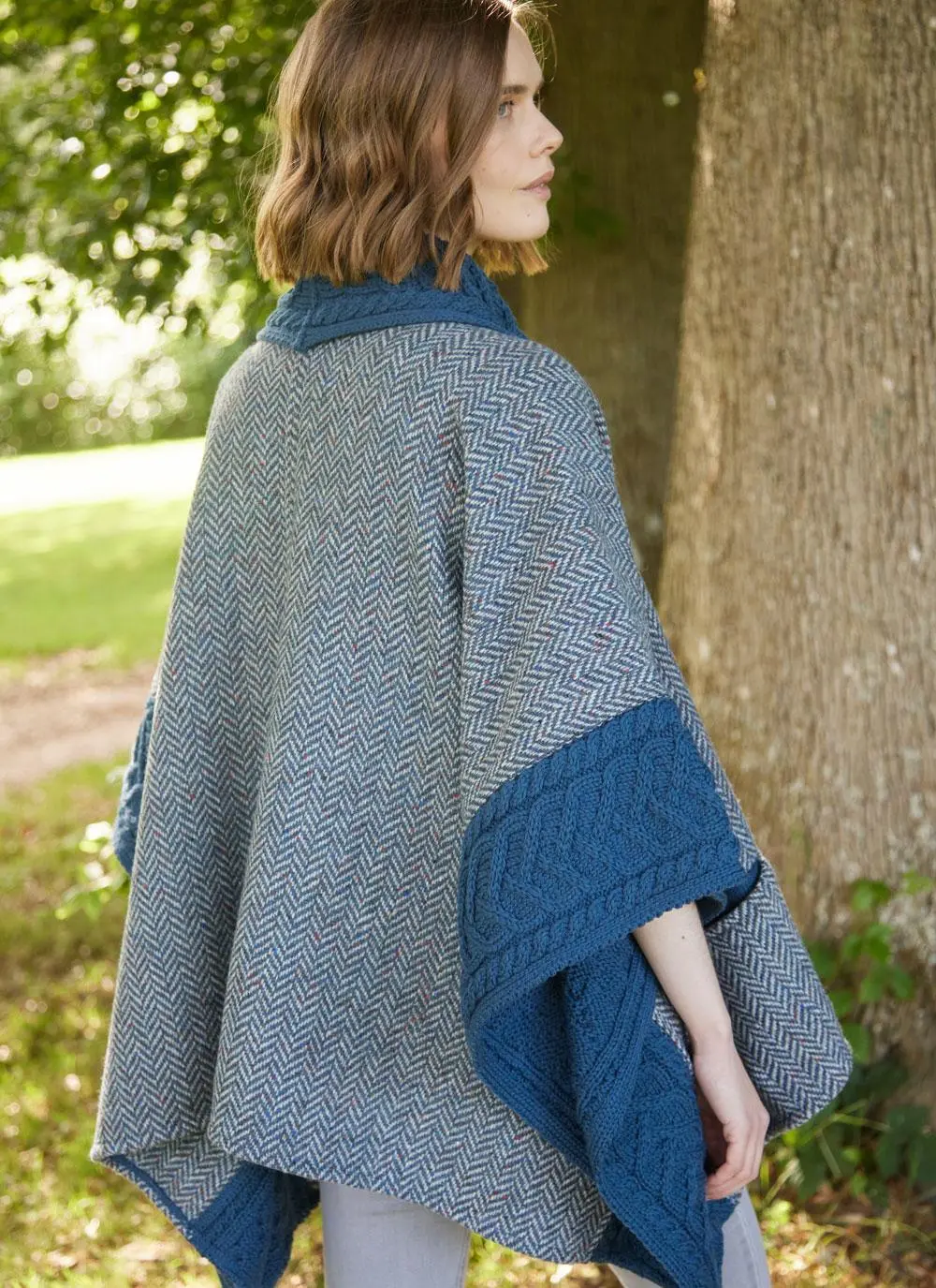 Here we have combined the sophistication of woven tweed and the softness of knitted merino wool. This open-style poncho is made in Ireland with herringbone tweed and complementary Aran trims. Thoughtfully finished with two front generous pockets.