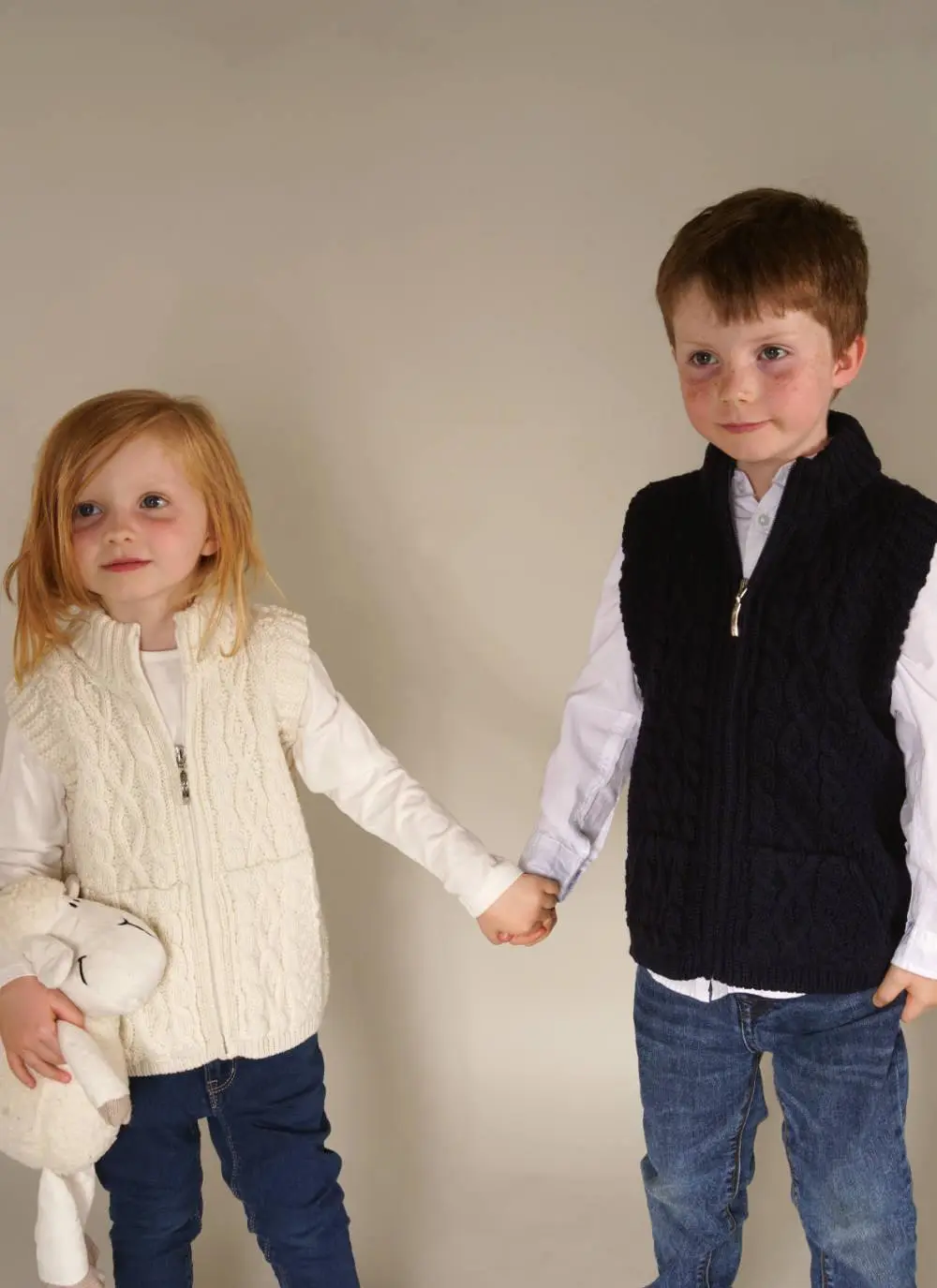 This zip-up Aran gilet is knit with soft Merino wool to keep your little one warm and cozy. It features a mix of traditional diamond, cable and moss stitches which date back to 19th century Ireland. Finished with two pockets and a high neck ribbed collar for extra snugness.