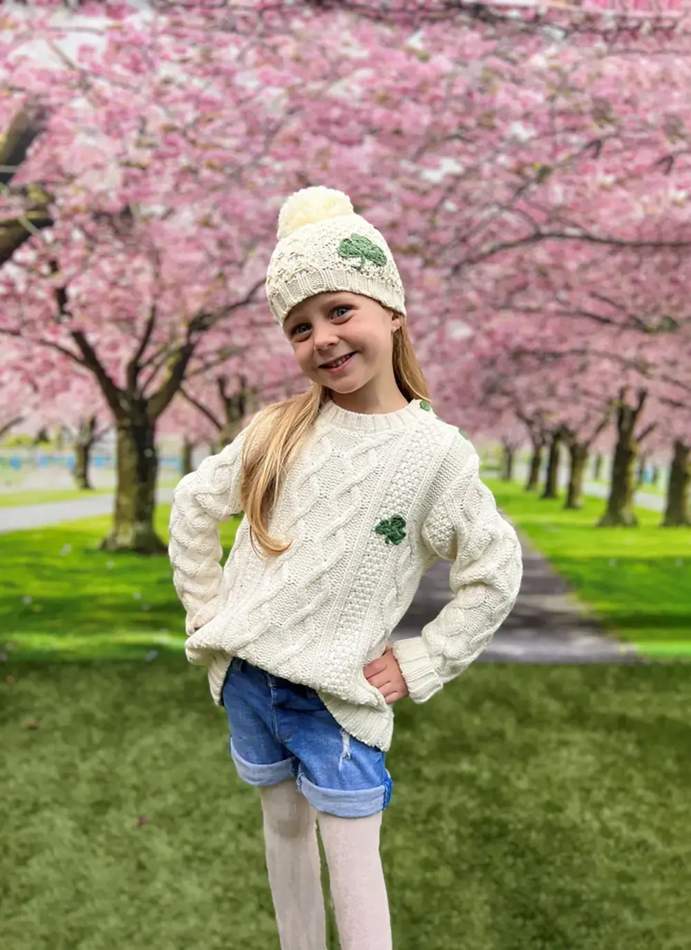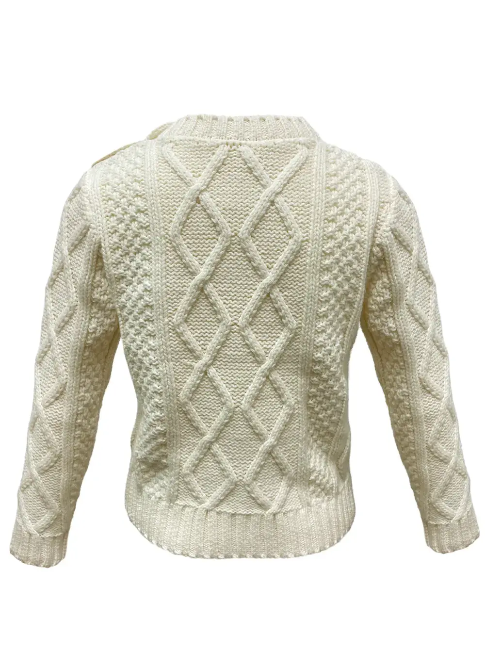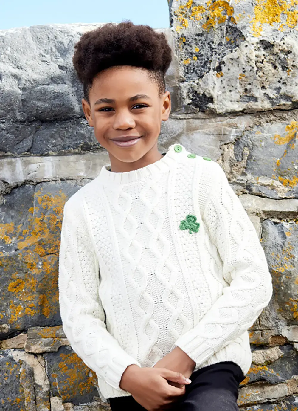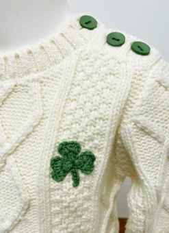 Beautifully hand crocheted shamrocks sit elegantly on this traditional cream Aran sweater for kids. This sweater features a combination of traditional Aran stitches, including the well-known diamond stitch as the main feature. Three green buttons sit on one side of the shoulder as a contemporary design. It ensures that the Aran can be taken on and off easily. This is the ideal Irish gift for any stylish Irish kid!