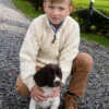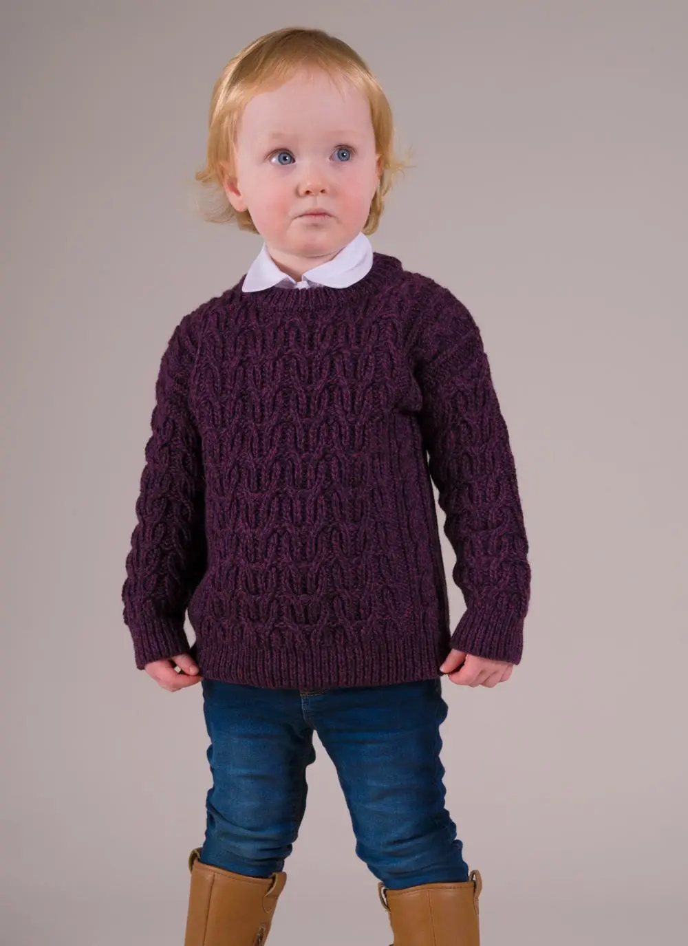 This Aran crew neck sweater is made with 100% Merino wool to keep your little one cozy and comfy. It is knit with traditional cable stitches which symbolize safety and good fortune.