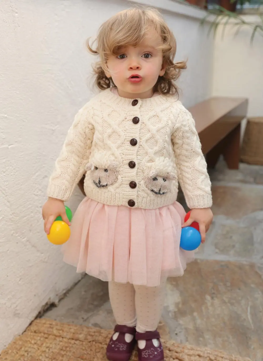 This baby button-up sweater has been hand-knit with traditional Aran stitches and features a delightful sheep face on each front pocket. A wonderfully cozy cardigan that will keep your little one warm throughout the seasons, it is made from soft and sustainable merino wool.Â