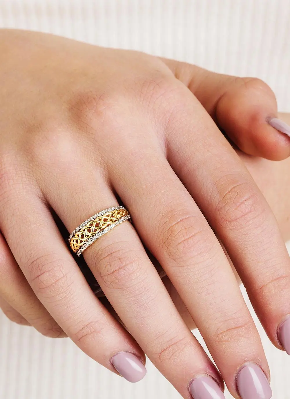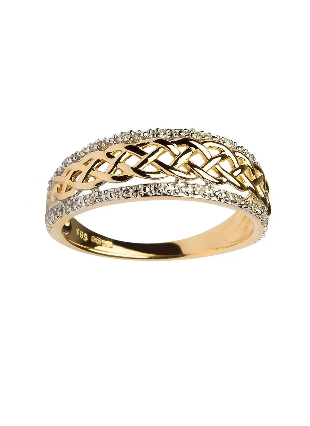 Enduringly elegant, this ring will be loved for a lifetime and beyond. Between two bands encrusted with dazzling diamonds is a 14-carat yellow gold Celtic knot motif. Its intricate, interwoven loops signify unending love, making this the perfect wedding band for someone with Irish roots.Â