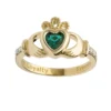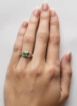 This spectacular 14-carat yellow gold ring is a take on the traditional Claddagh ring, with diamond-encrusted hands and crown and a dazzling emerald at the heart. Inspired by Ireland’s rich Celtic heritage, the Claddagh is an iconic symbol of love, loyalty and friendship. The Claddagh ring is traditionally worn on the left hand with the heart facing outward to symbolize engagement, and pointed inward for marriage.