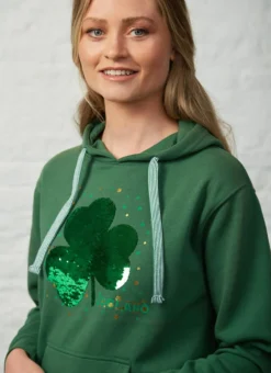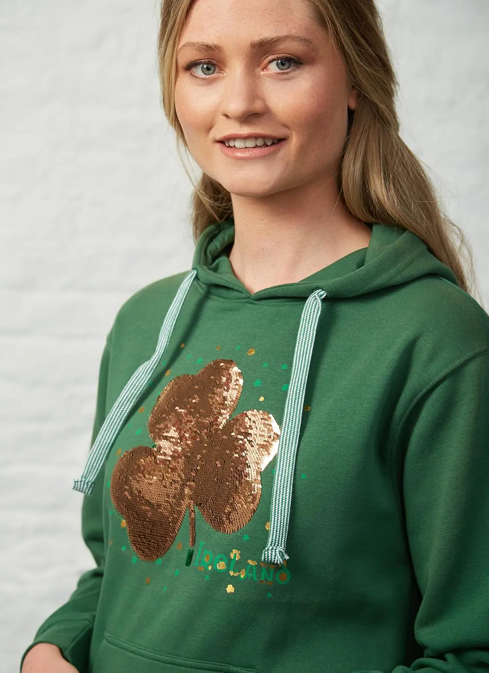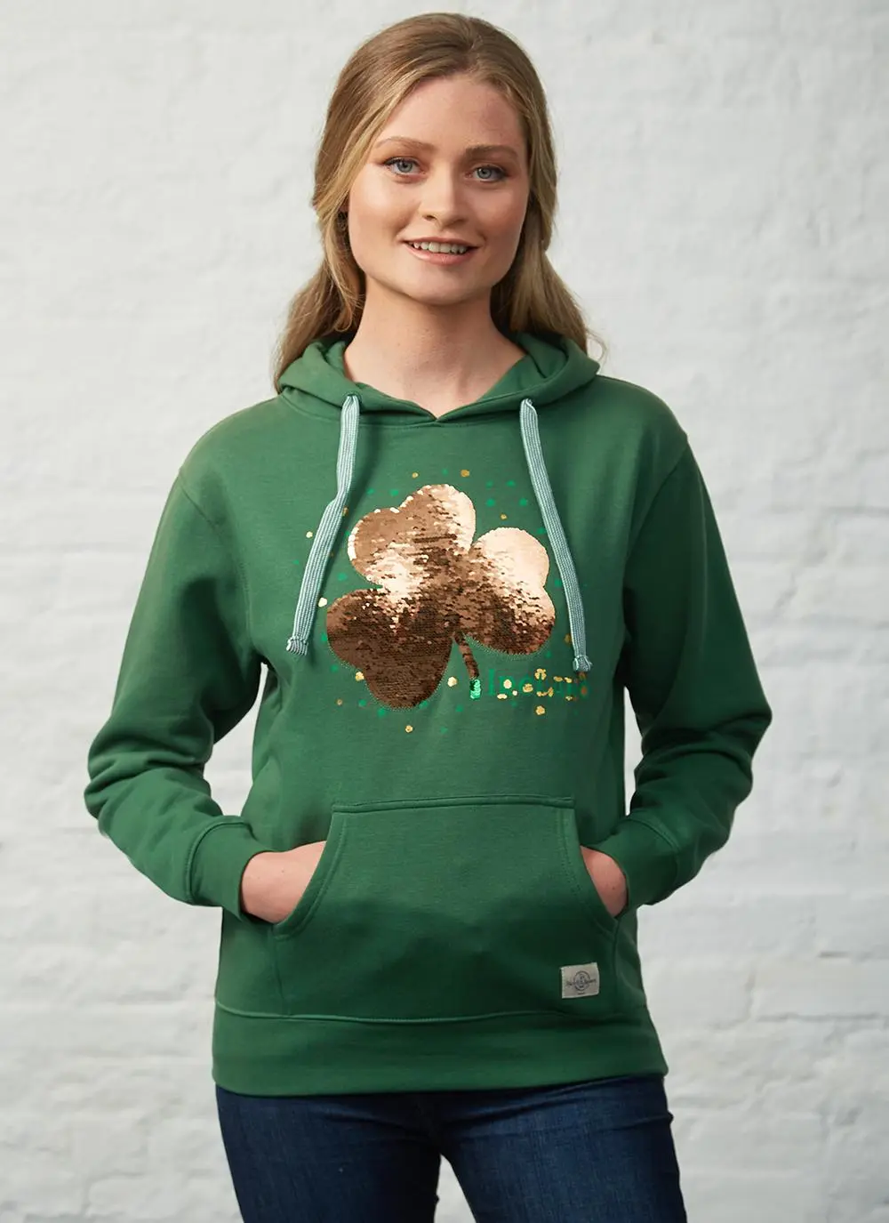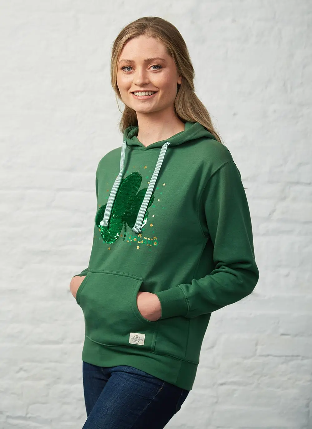 Sparkle & Shine! The shamrock is a Celtic symbol for love, faith and hope, and it is said to bring good luck to all who wear it. This cozy hoodie, with large front pocket, is embossed with the shamrock using two way sequins in green and gold.Â